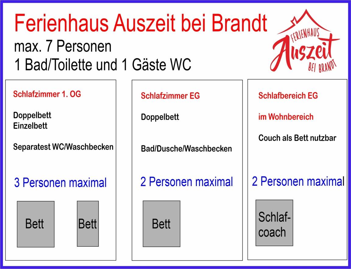 Belegbar mit max. 7 Personen. 3 Schlafbereiche siehe Übersichtsplan.