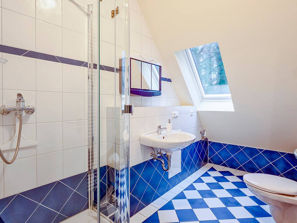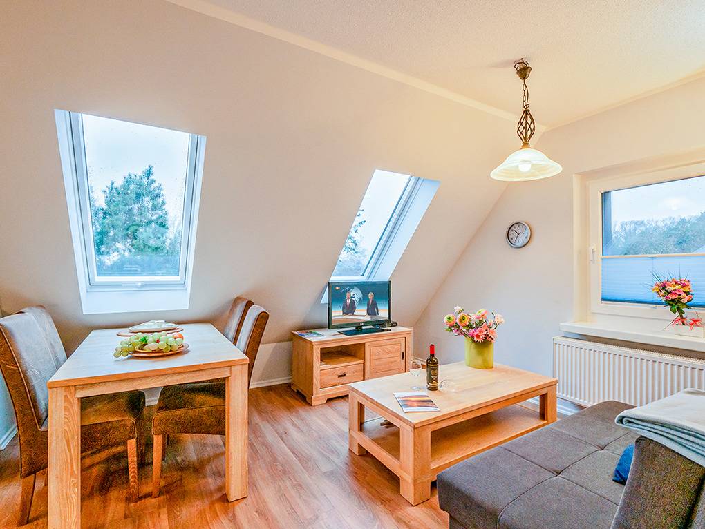 D 16.23 Wohnung 2-4 Pers.: 2-Zimmerwohnung, 33 qm Wohnfläche, 1. Etage (Dachschrägen). Gemütlicher Wohn-/Essraum mit Ausziehcouch (2 Pers.), Sat-TV, Esstisch, Küchenzeile (Backofen, Spülmaschine). Doppelzimmer. Bad/WC. Sitzecke im Garten.