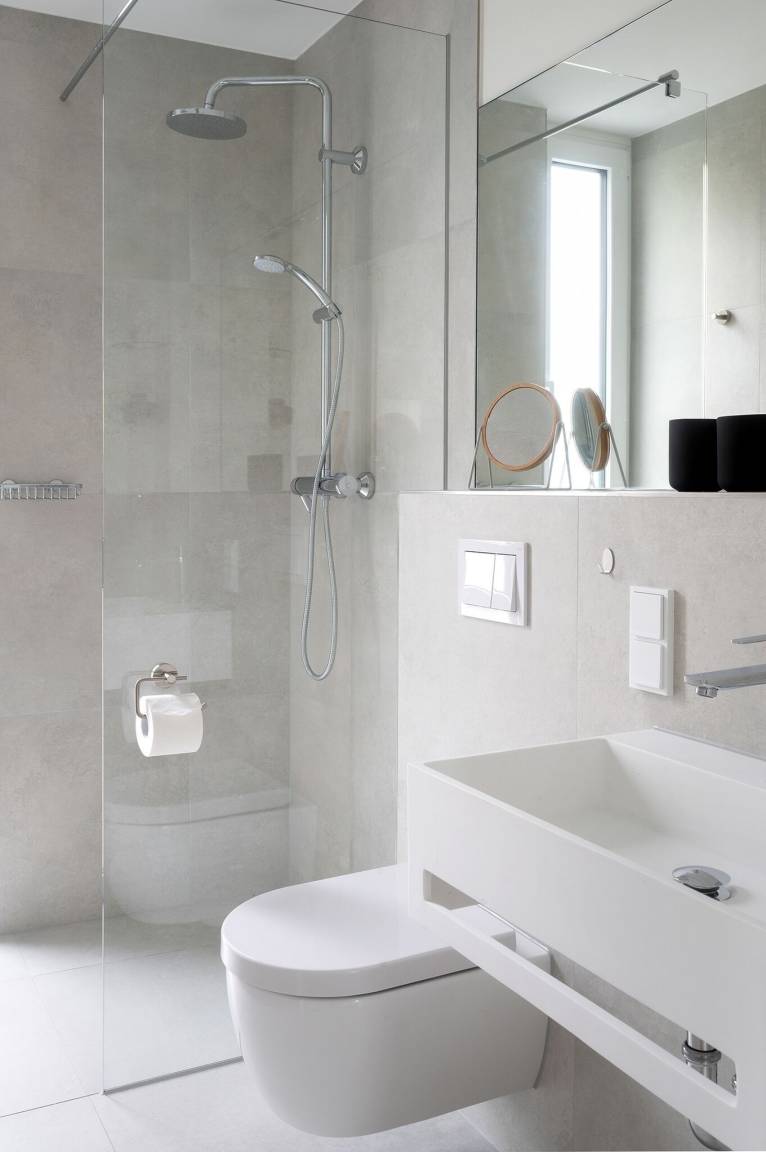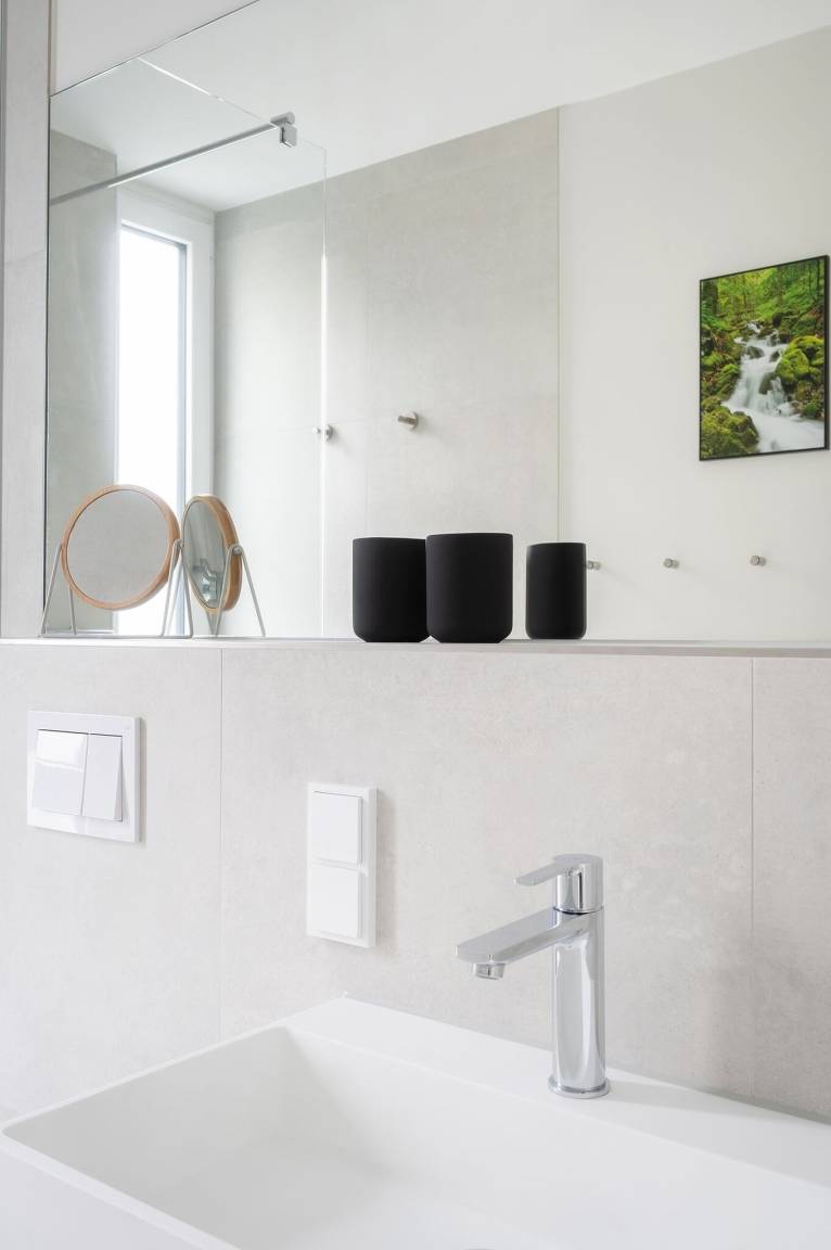 Das Badezimmer ist mit einer bodengleichen Dusche mit Regendusche ausgestattet.