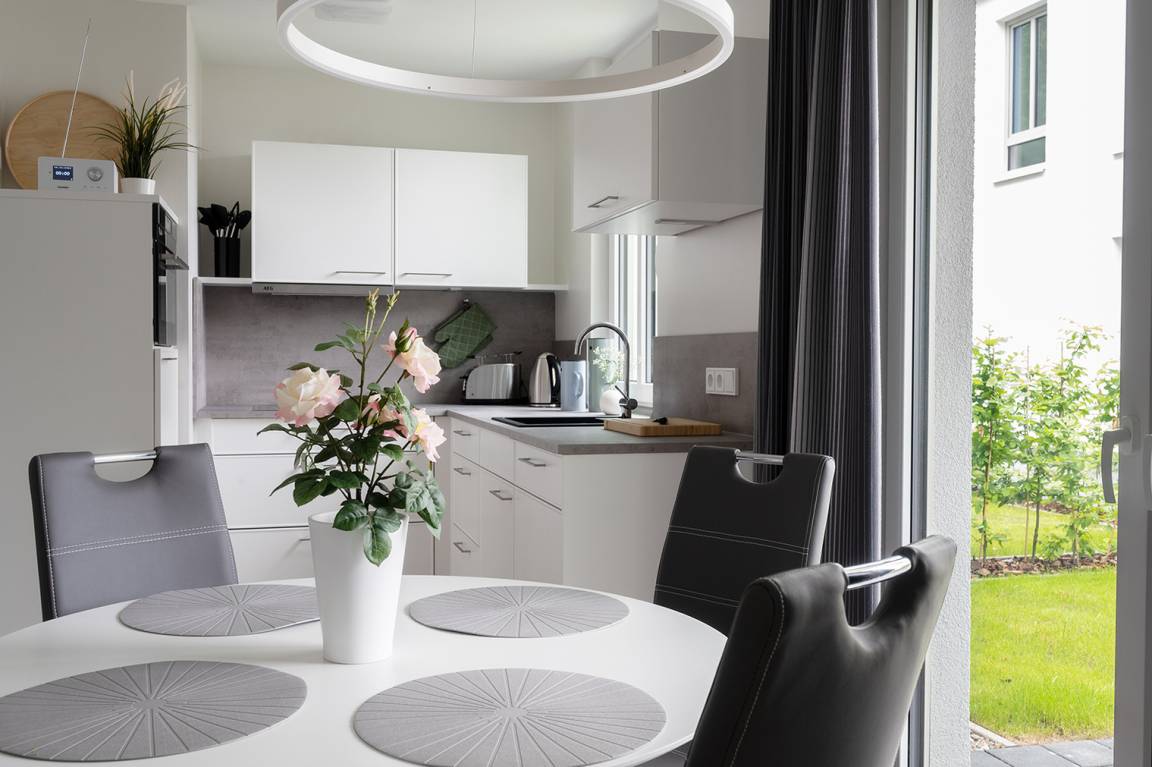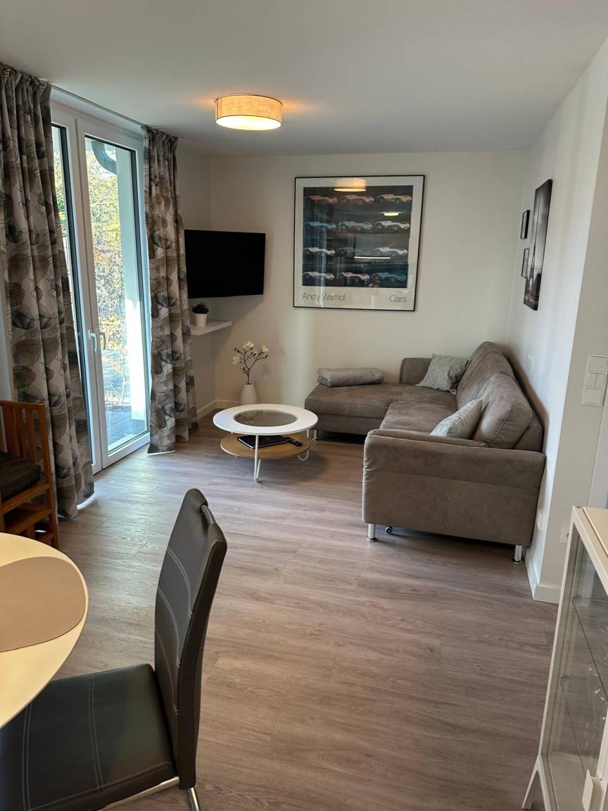 Bodentiefe Fenster ermöglichen einen direkten Zugang zur Terrasse oder zum Balkon, welche mit Gartenmöbeln ausgestattet sind. Ausgewählte Möbel und hochwertige Böden, schaffen Gemütlichkeit und ein ruhiges Raumgefühl.