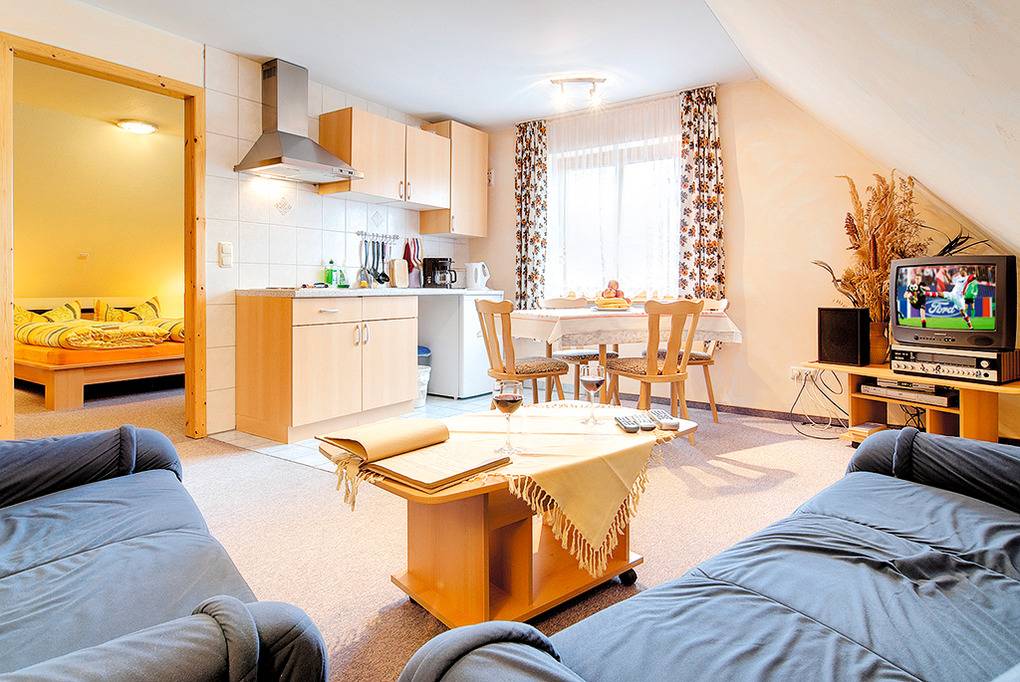 D 16.20 Wohnung 2-4 Pers.: 3-Zimmerwohnung, 50 qm Wohnfläche über 2 Etagen. 1. Etage: Gemütlicher Wohn-/Essraum mit Sat-TV, Radio, Couchgarnitur, Esstisch, Pantry-Küche. Doppelzimmer. Bad/WC. Raumspartreppe ins Dachgeschoss (Dachschrägen): 2-Bettzimmer mit kl. Sitzecke, offen zur 1. Etage.