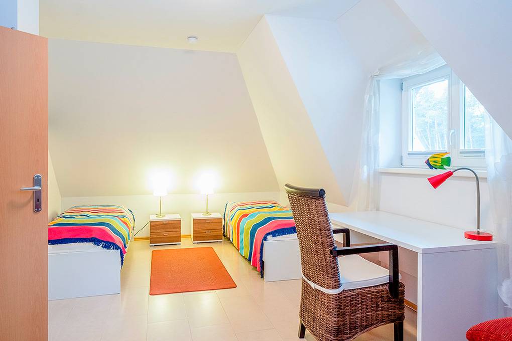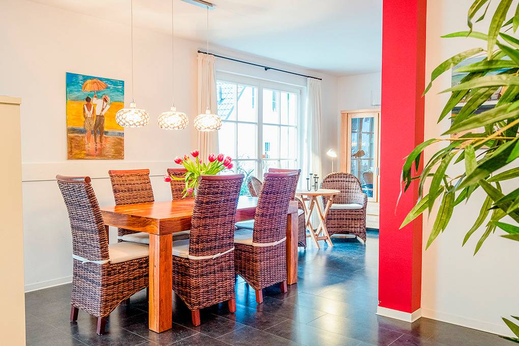 D 16.8B Ferienhaus 3-6 Pers.: 3-Zimmerhaus mit 90 qm Wohnfläche über 2 Etagen. Parterre: Heller Wohn-/Essraum mit drehbarem Kaminofen, Couchgarnitur (Schlafcouch 2 Pers.), Sat-TV, Blu-Ray-Player, Radio/CD, Esstisch, moderner Küchenzeile (Backofen, Mikrowelle, Spülmaschine). Bad/WC. 1. Etage: Doppelzimmer. 4-Bettzimmer mit 2 Einzelbetten, Schlafcouch (2 Pers.), Schreibtisch. Bad: Du, Wb, WC, Fön, Radio. Hinweis: Bitte beachten Sie, dass trotz 8 ausgewiesener Schlafmöglichkeiten die maximale Personenzahl von 6 nicht überschritten werden darf.