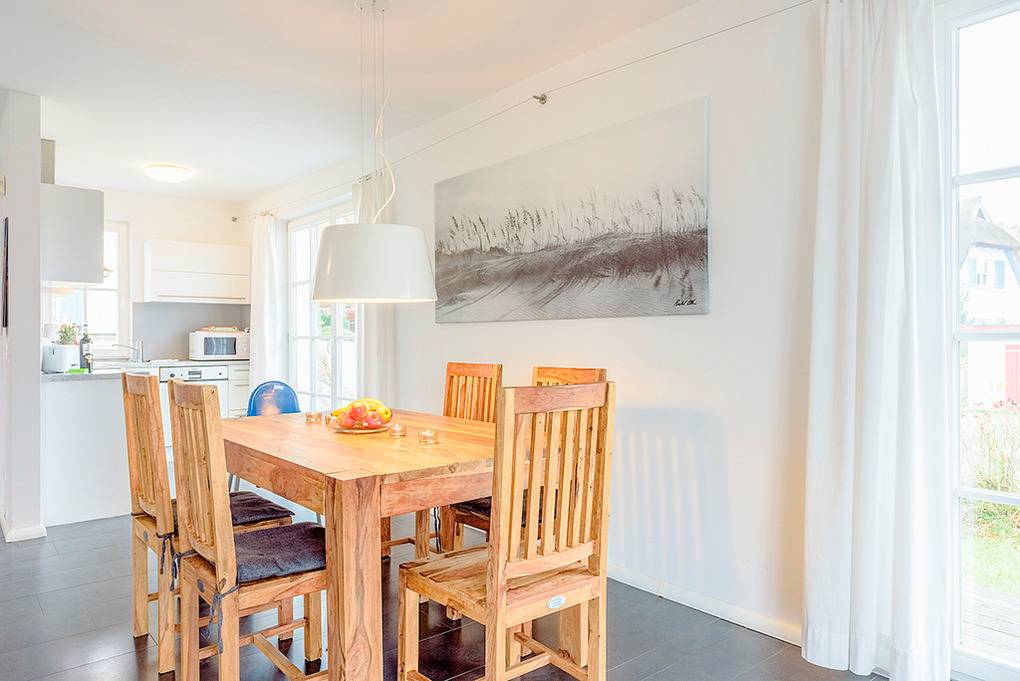 Haus: Schönes Reetdachhaus mit Kaminofen. Moderne Ausstattung, geschmackvolle Möblierung. Zentral-/Fußbodenheizung. Waschmaschine. Nichtraucherhaus. Kostenloser Internetzugang über Wlan. Große Terrasse mit Sitzmöbeln, Grill. Hübscher kleiner Garten. Gartenhaus für Fahrräder. 2 Pkw-Stellplätze am Haus.