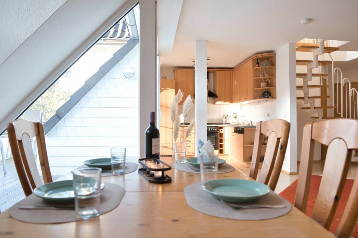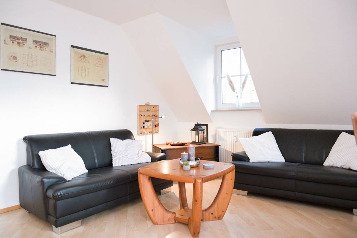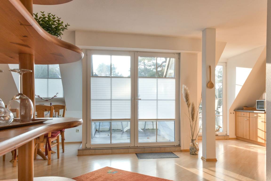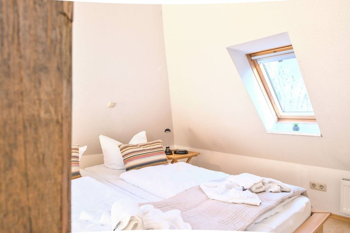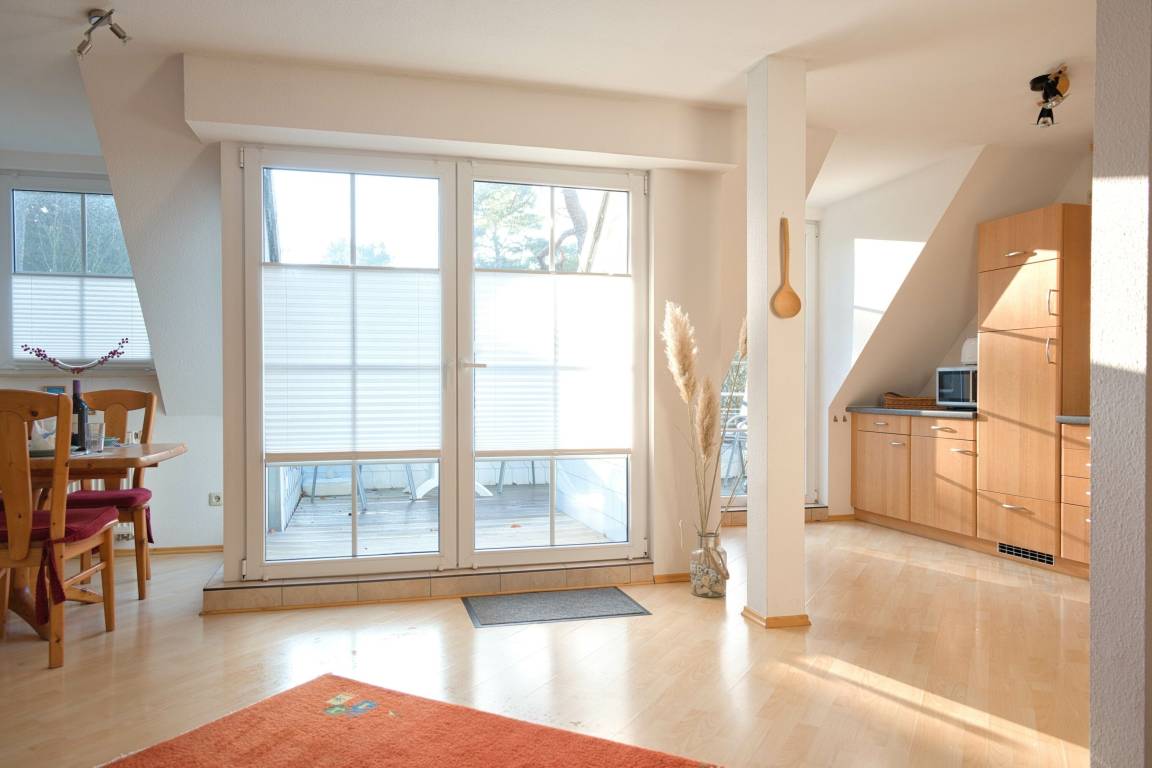 Die Fewo Gabriele zeichnet sich durch ihre helle Ausrichtung nach Süden und die vielen Fenster mit Insektenschutz sowie einen Balkon aus. Die Nutzung des W-LAN/Internets ist kostenfrei. In der unteren Ebene befinden sich eine voll ausgestattete Einbauküche, ein gemütlicher Wohn- und Essbereich, ein Schlafzimmer mit Doppelbett und ein Badezimmer mit Fußbodenheizung und Dusche. Über eine Holztreppe gelangt man in die Galerie, wo sich das zweite Schlafzimmer mit Doppelbett befindet. Der Balkon ist mit Gartenmöbeln ausgestattet. Für Autos steht ein kostenloser PKW-Stellplatz zur Verfügung und auch Fahrräder können vor dem Haus abgestellt werden.