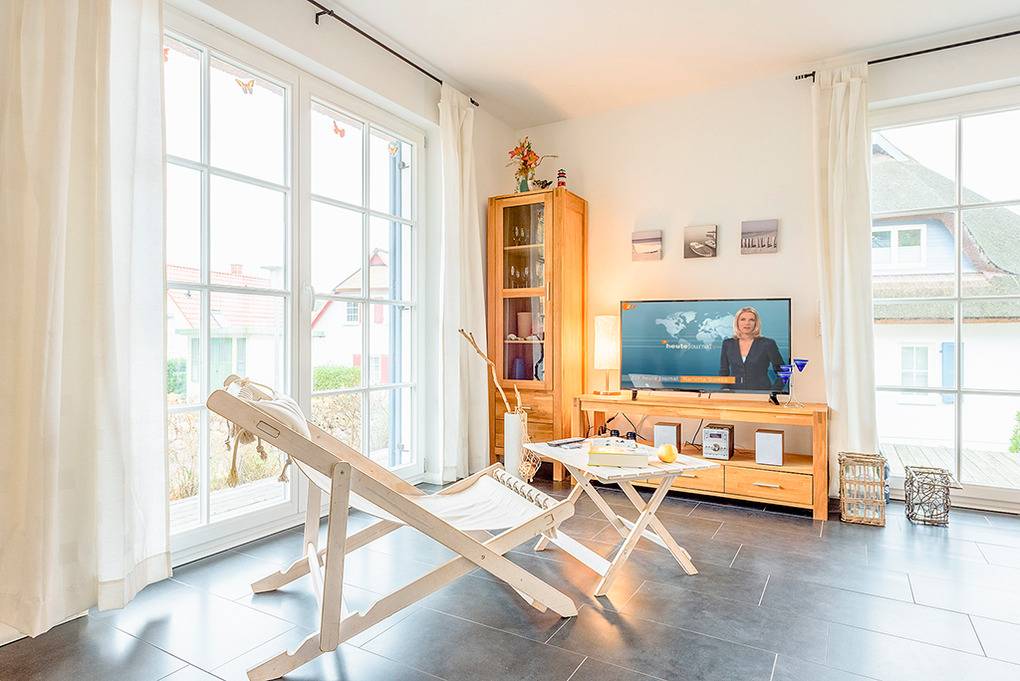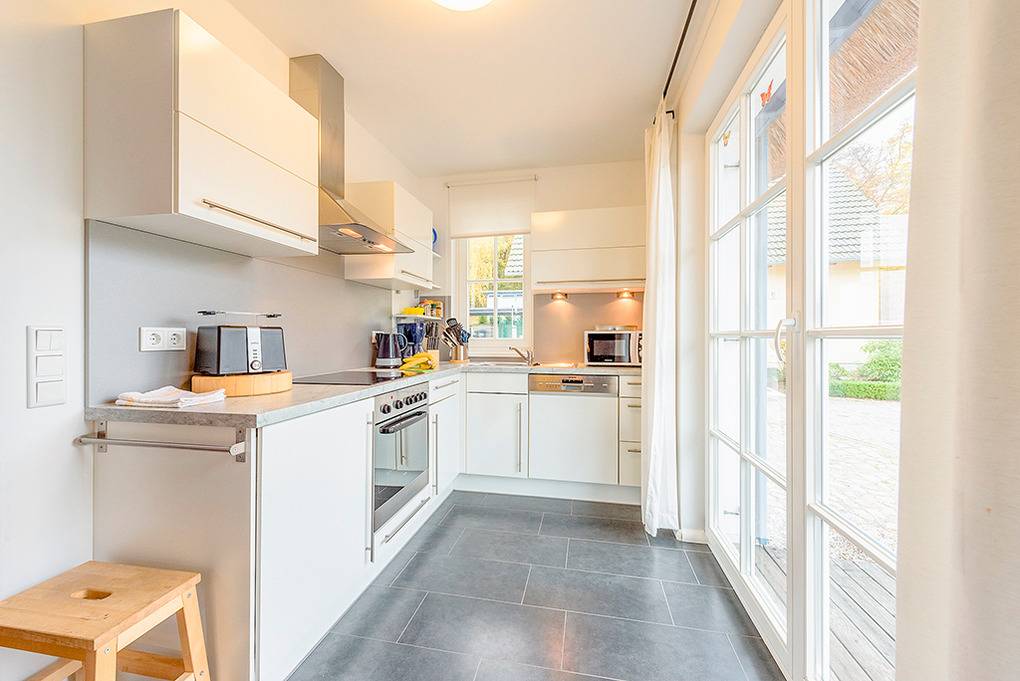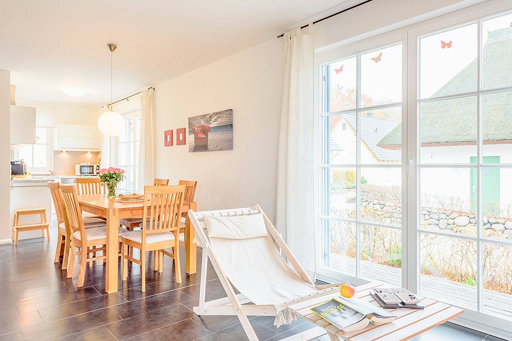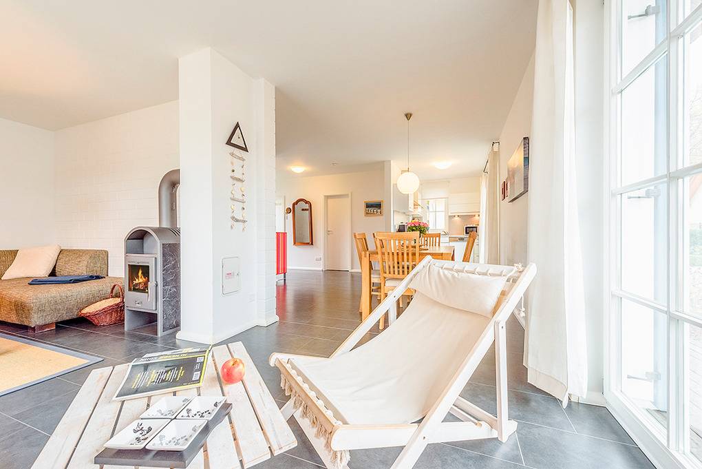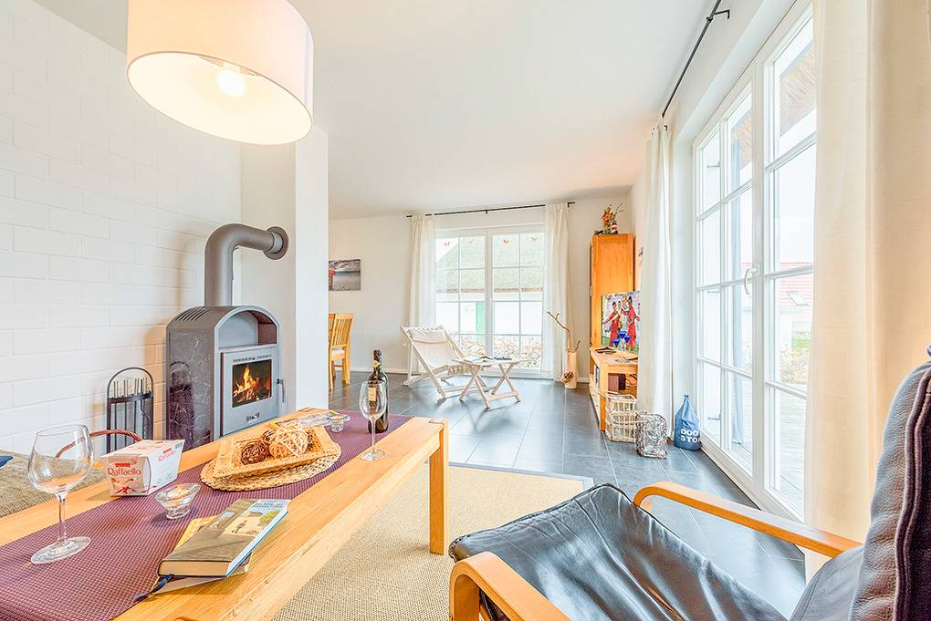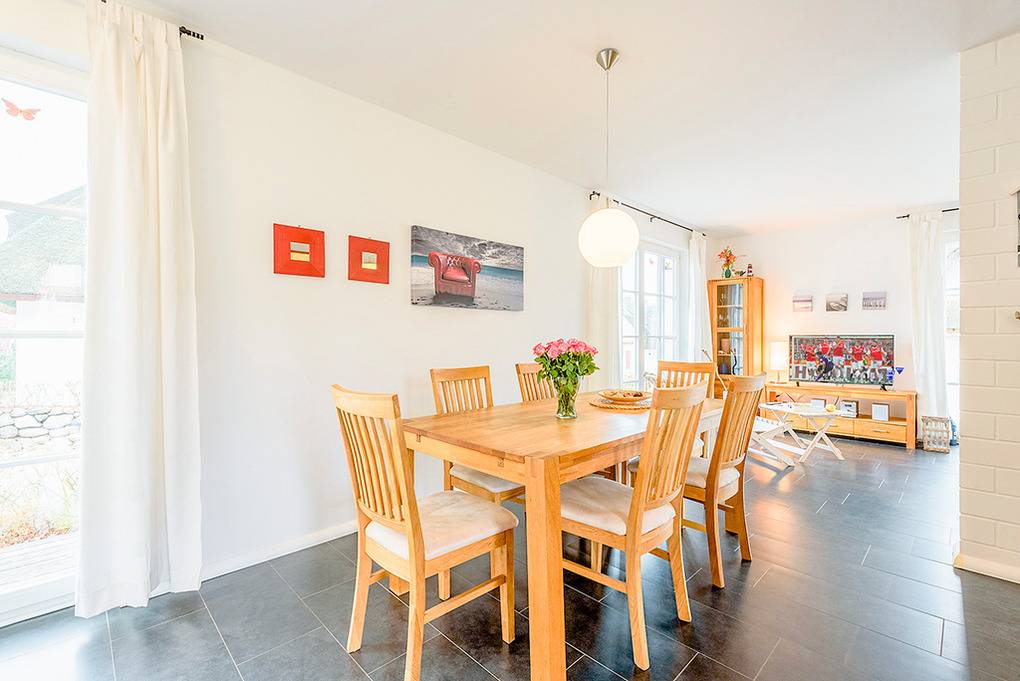 Haus: Schönes Reetdachhaus mit Kaminofen. Moderne Ausstattung, geschmackvolle Möblierung. Zentral-/Fußbodenheizung. Nichtraucherhaus. Kostenloser Internetzugang über Wlan. Große Terrasse mit Sitzmöbeln, Grillkamin. Gartenhaus für Fahrräder. 2 Pkw-Stellplätze am Haus.