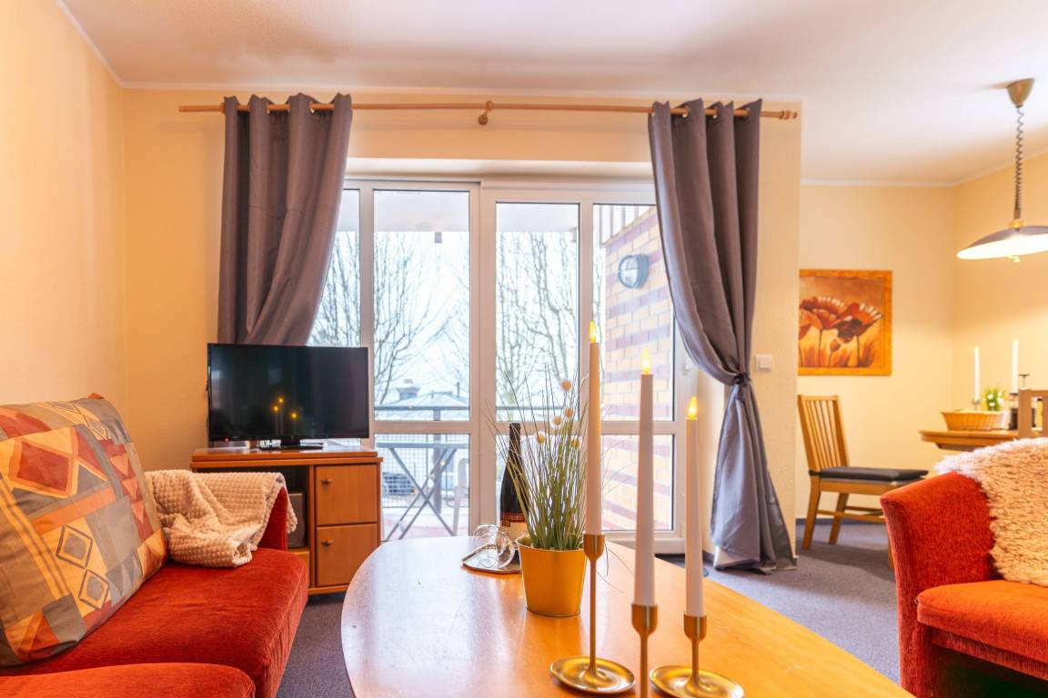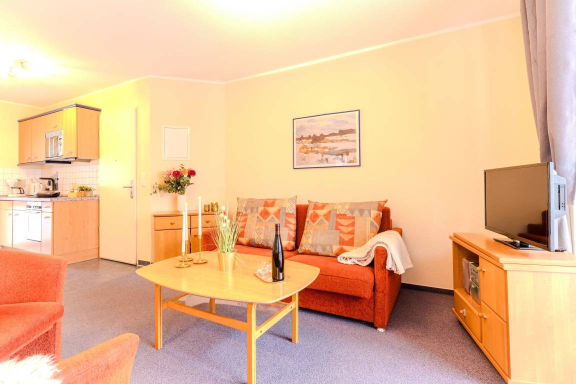 • Helles Wohnzimmer mit Fernseher, Radio und gemütlicher Schlafcouch