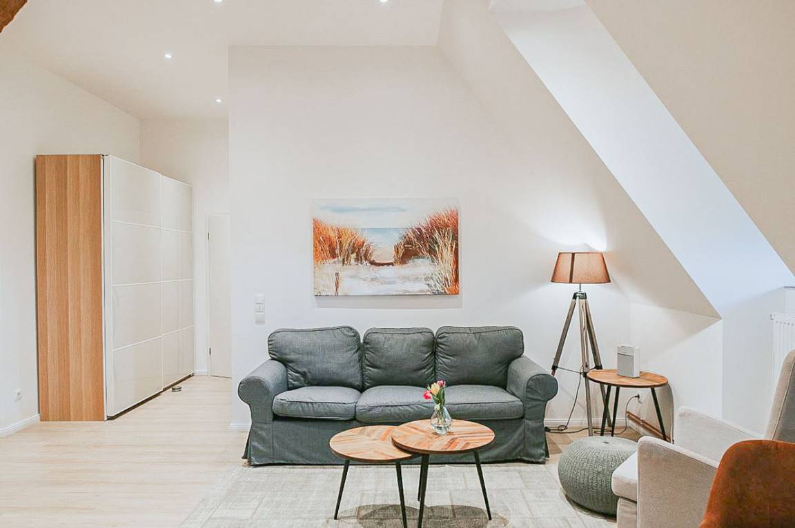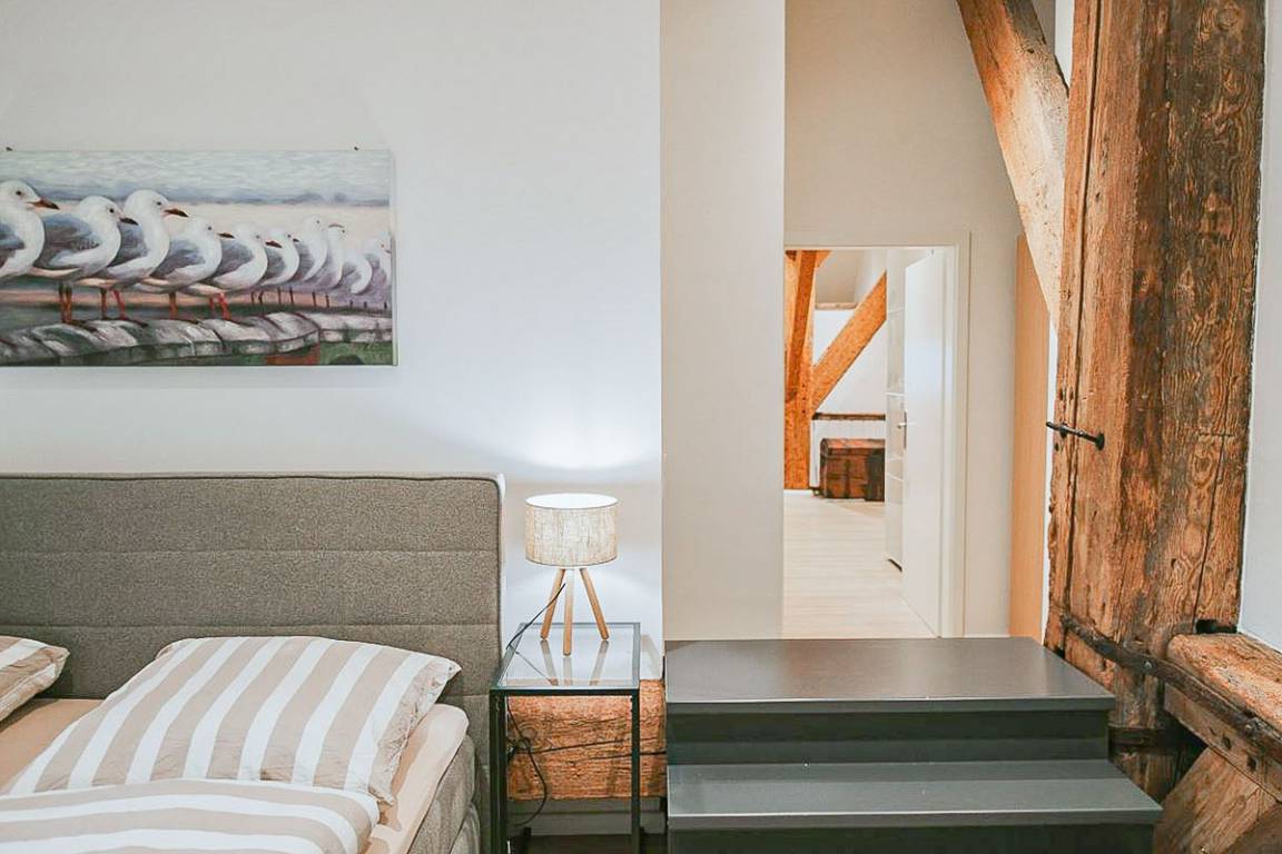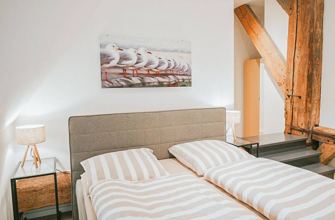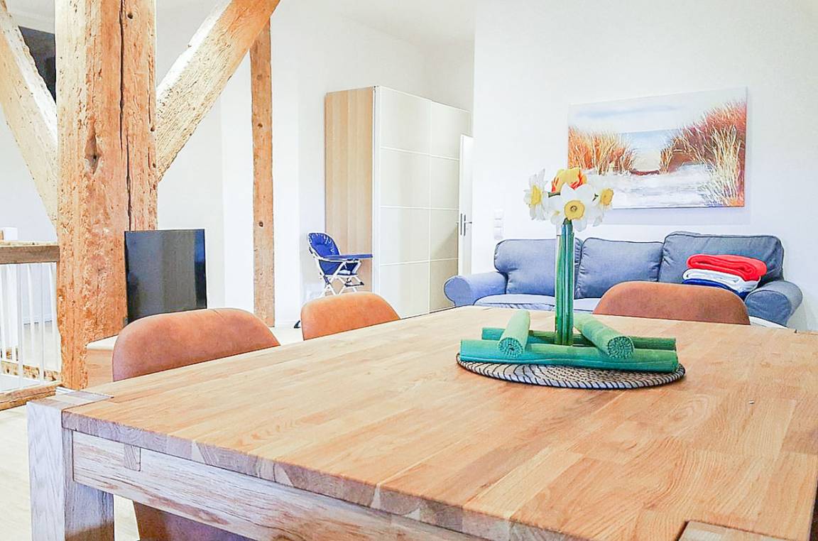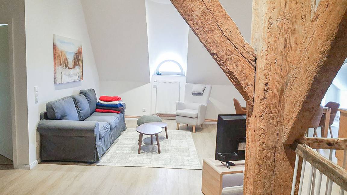Hoch oben unterm Reetdach öffnet sich die Weitblick-Wohnung wie ein kleines Universum voller