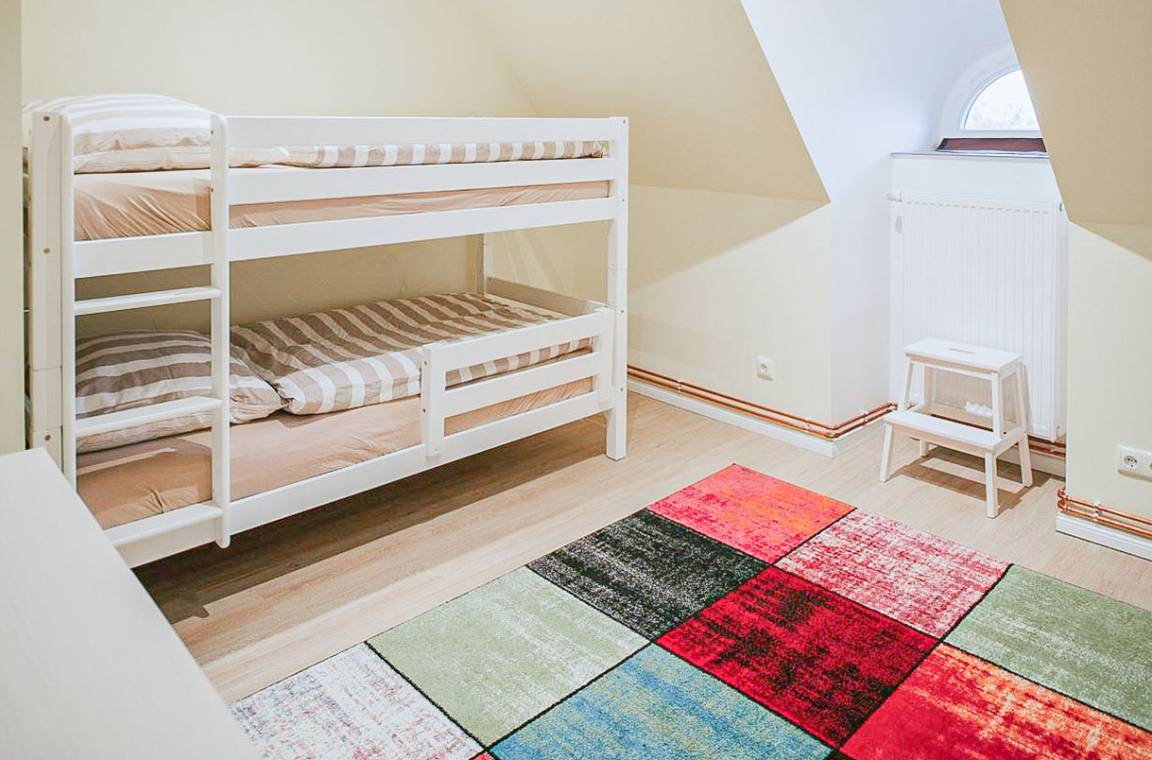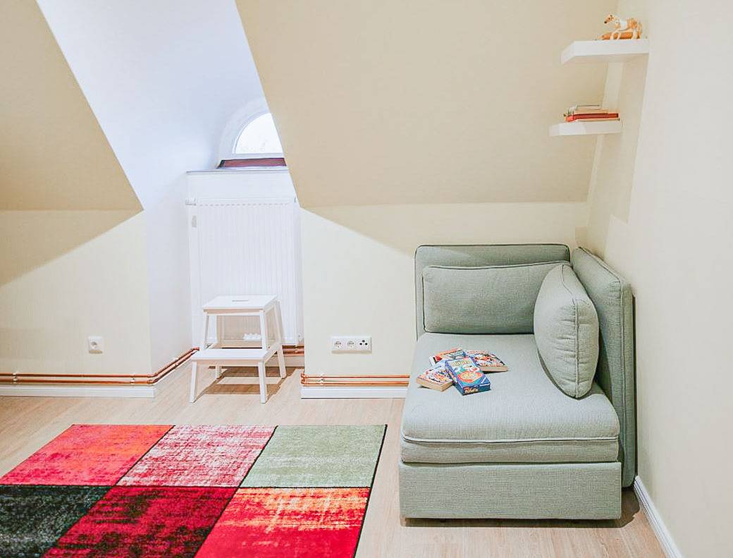 Im Kinderzimmer ist alles farbenfroh, ein Etagenbett, ein Sessel zum Kuscheln und Lesen – der Sessel kann bei Bedarf