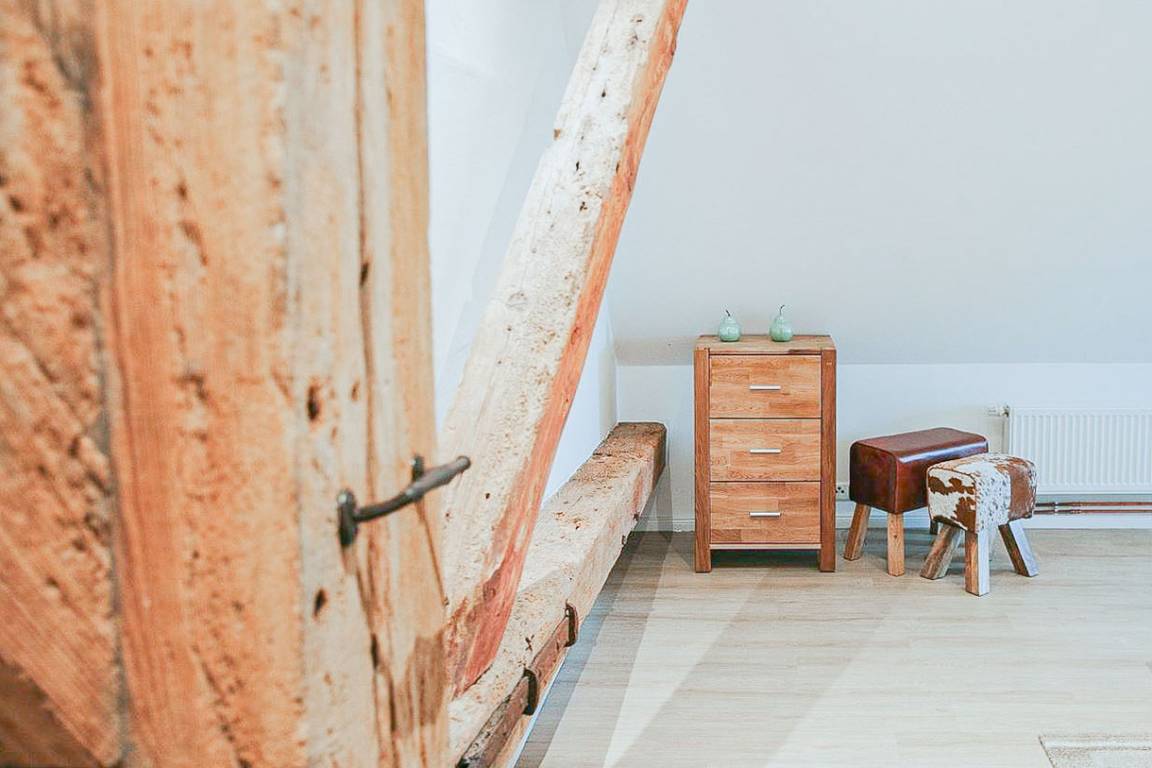 Licht, Raum und Charme. Die starken Holzbalken, die das Dach tragen, sind Teil der Wohnung und verleihen