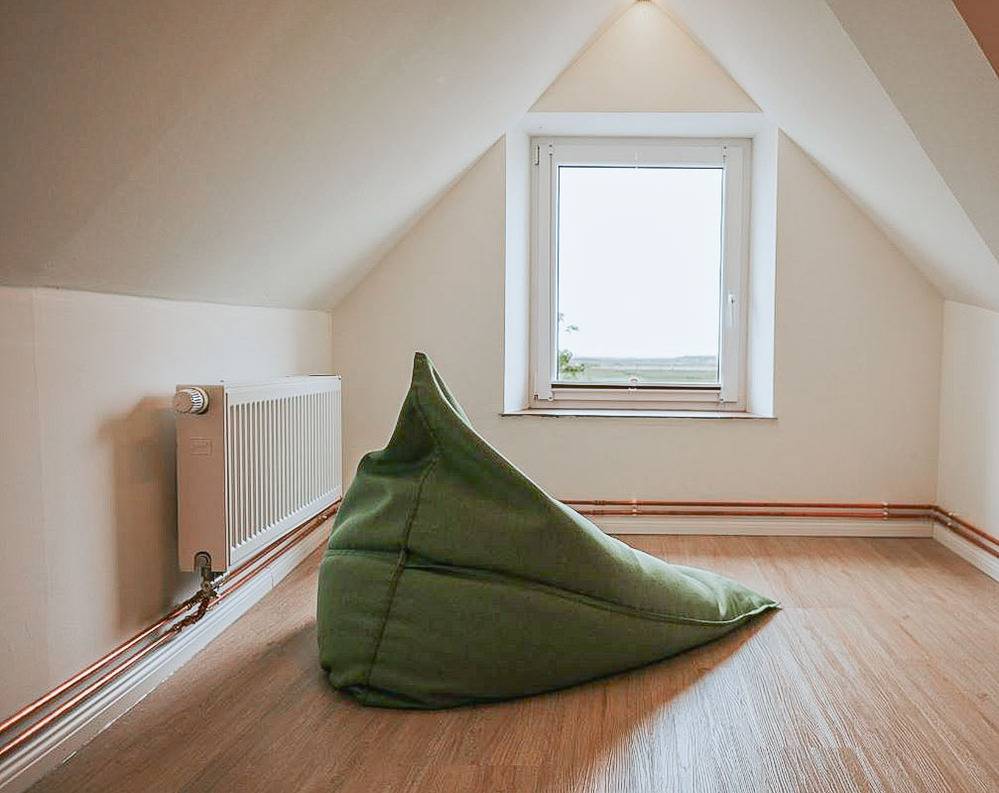 unter den charmanten Schrägen – mit Sitzsack im Giebel, um die Ferne zu beobachten oder in Gedanken zu versinken.