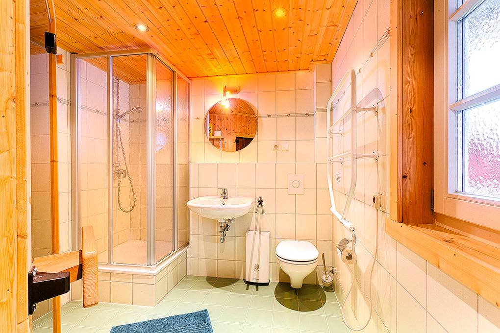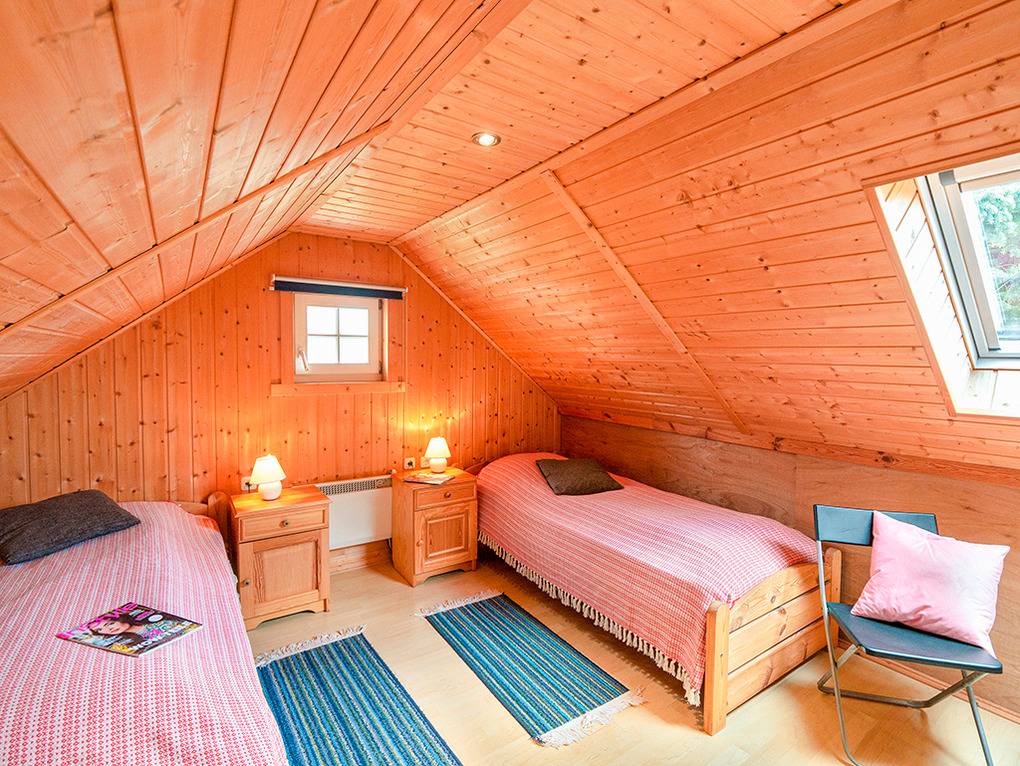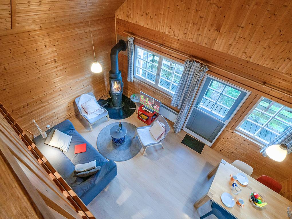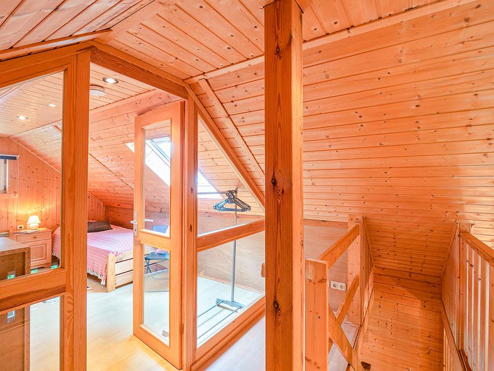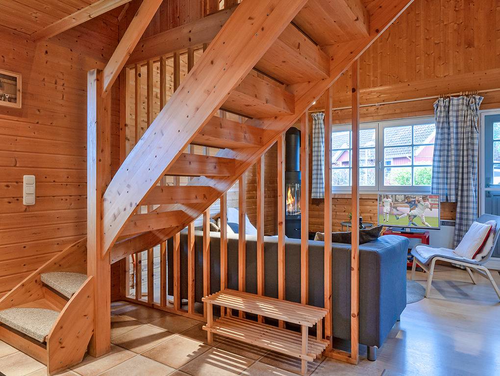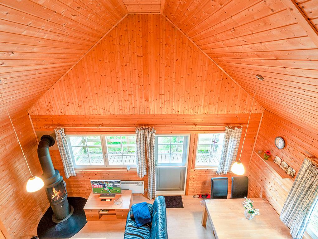 D 48.1A Ferienhaus 2-4 Pers.: 3-Zimmerhaus mit 55 qm Wohnfläche über 2 Etagen. Nichtraucherhaus. Parterre: Bis in den Dachgiebel ausgebauter Wohn-/Essraum mit Kaminofen, Sitzgruppe, TV, Esstisch, Küchenzeile (Backofen, Spülmaschine). Doppelzimmer. Bad: Du, Wb, WC, Sauna, Waschmaschine. Dachgeschoss mit Schrägen: 2-Bettzimmer.