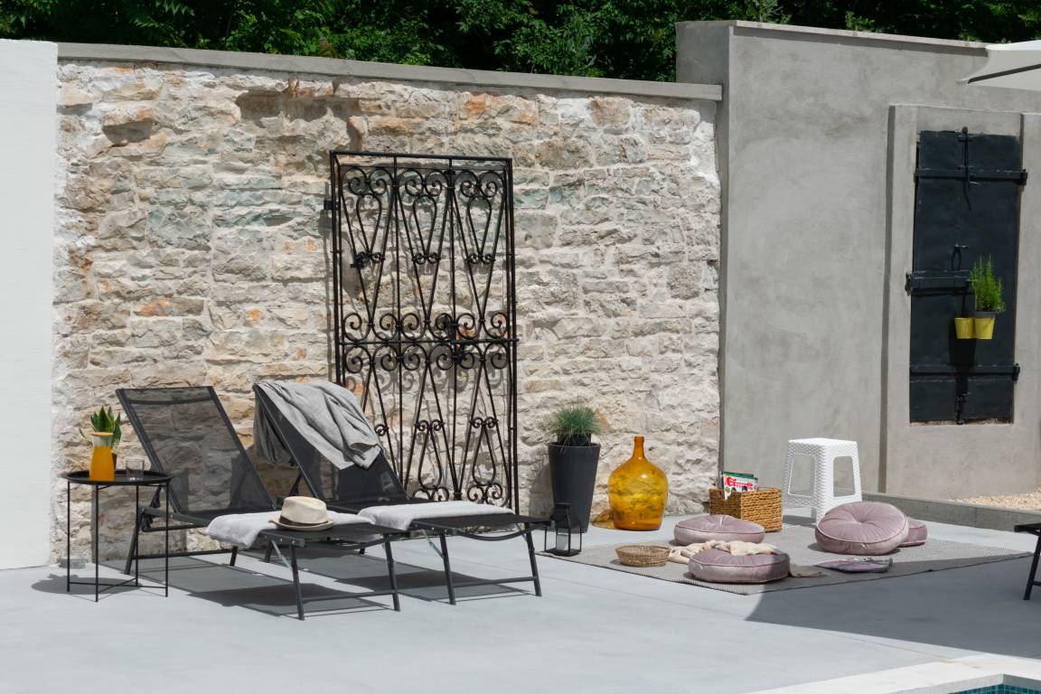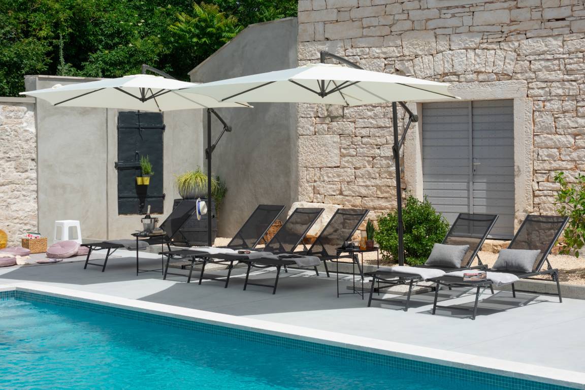 Das Wichtigste im Garten ist ein schöner 30 m² großer Swimmingpool mit eingebauter Treppe. Auf der einen Seite des Pools gibt es 8 Sonnenliegen mit 3 kleinen Tischen. Wenn Sie Schatten mögen, gibt es 2 große, versetzte Sonnenschirme. Auf der anderen Seite des Pools befindet sich eine Sitzecke für 6 Personen. Sie befindet sich neben einem Esszimmer, so dass Sie sogar den Fernseher im Inneren sehen können. Diese Sitzecke ist teilweise von einem Balkon überdacht. Neben dieser Sitzecke befindet sich ein überdachter, dekorativer Bereich mit Gras und Olivenbäumen.