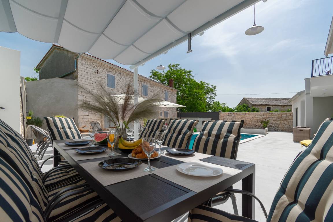 Dann gibt es einen Essbereich im Freien, der von einer Pergola überdacht ist. Diese Pergola kann geöffnet und geschlossen werden. Die Essecke hat 8 Stühle und ein Waschbecken daneben.