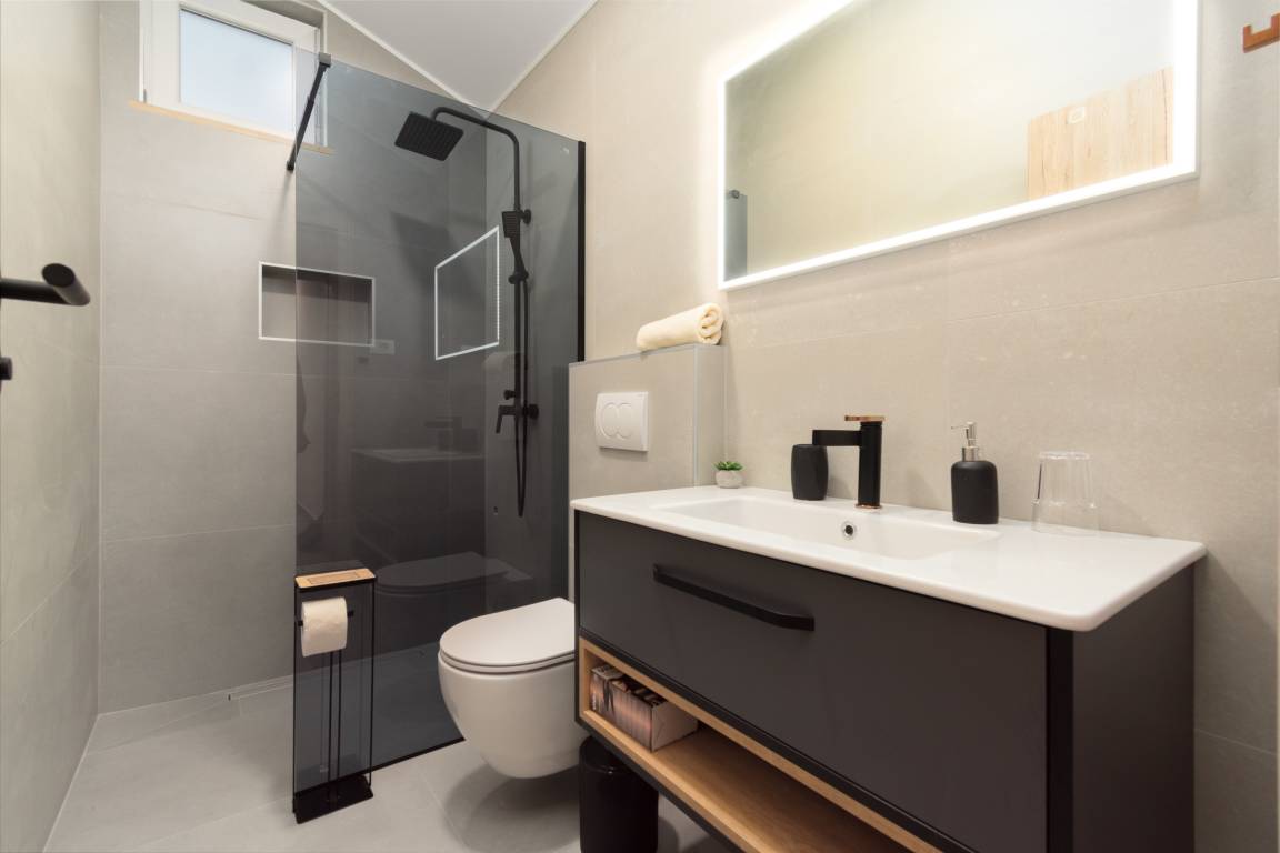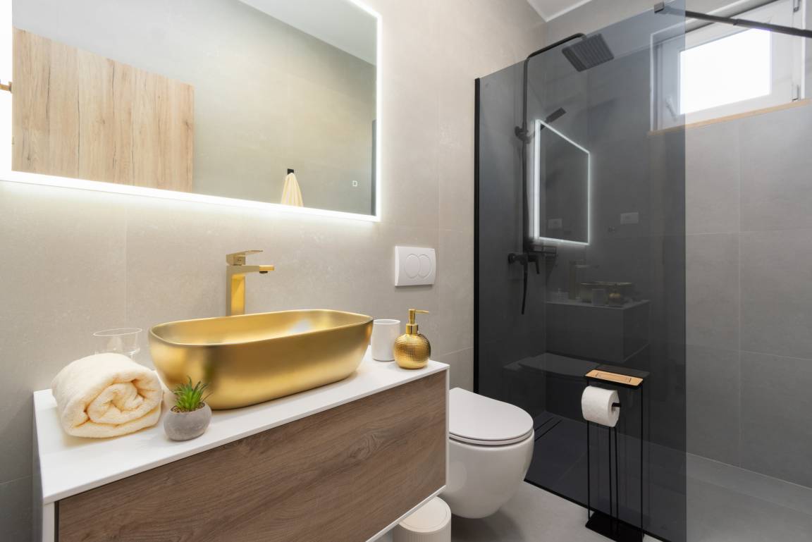 Als nächstes haben wir ein stilvolles, goldfarbenes Badezimmer mit einer begehbaren Dusche und einem riesigen LED-Spiegel.