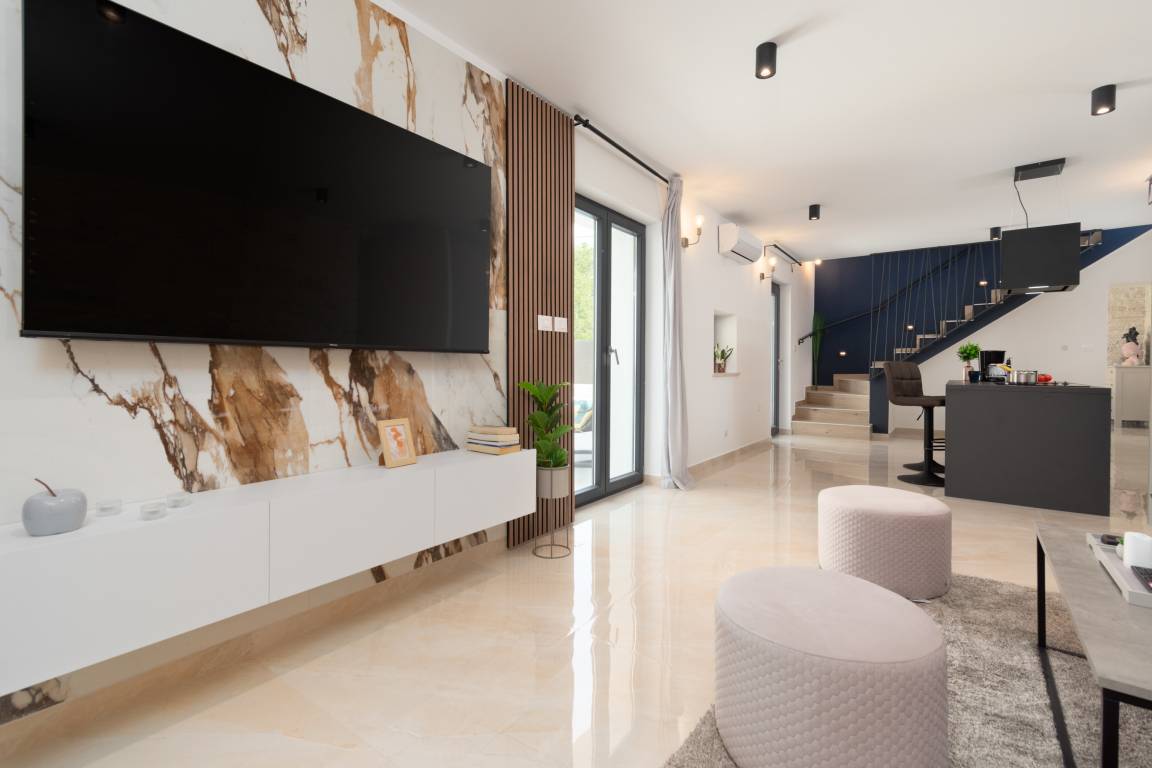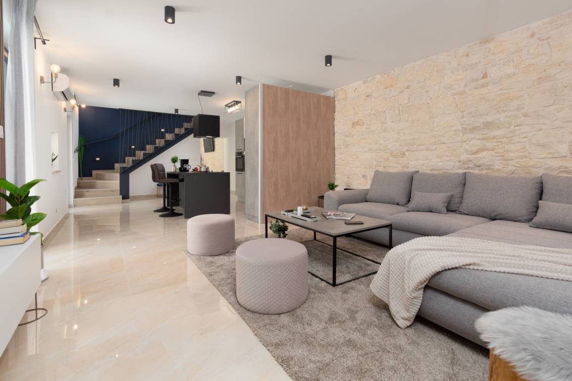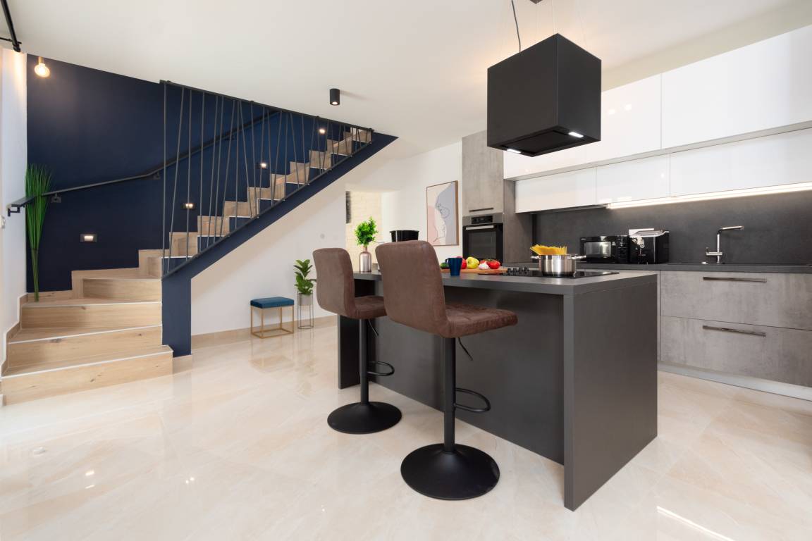 Im Erdgeschoss teilen sich ein Wohnzimmer und eine Küche den gleichen großen klimatisierten Raum.