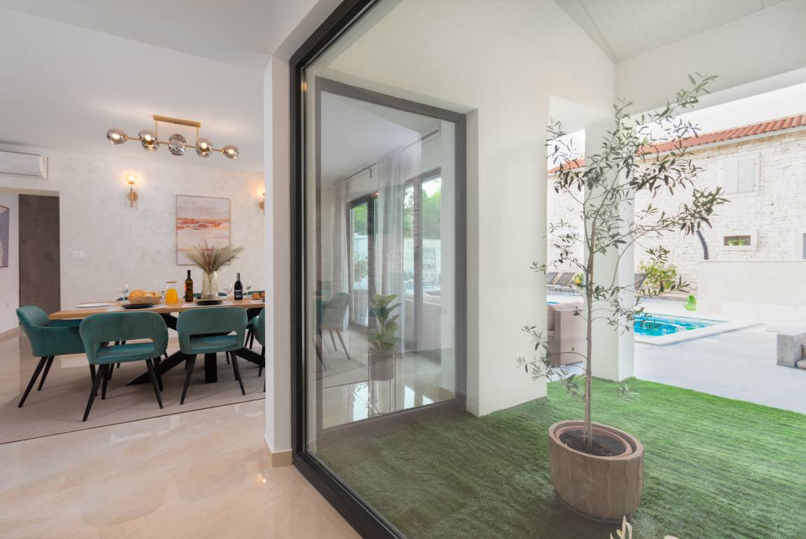 Neben der Küche gibt es einen Eingang zum separaten Esszimmer mit großen Fenstern und Glaswänden, sowie einen eigenen Fernseher und eine Klimaanlage für diesen Bereich. Vom Esszimmer aus gelangt man in einen kleinen Flur, der zu weiteren Zimmern führt.