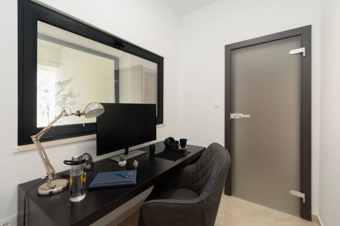 Der letzte Raum im Erdgeschoss ist ein eigenes Büro mit Schreibtisch, Stuhl, kleinem Ventilator und einem 32"-Monitor.