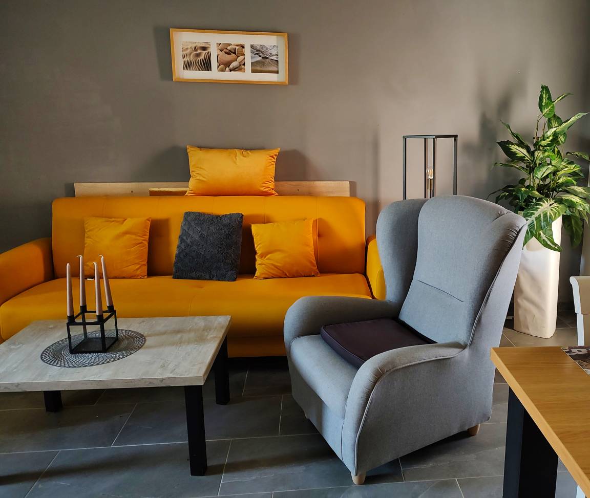 Wenn die Abende doch mal etwas kühl werden sollten, schafft der elektrische Kamin behagliche Wärme auf dem bequemen Sofa.