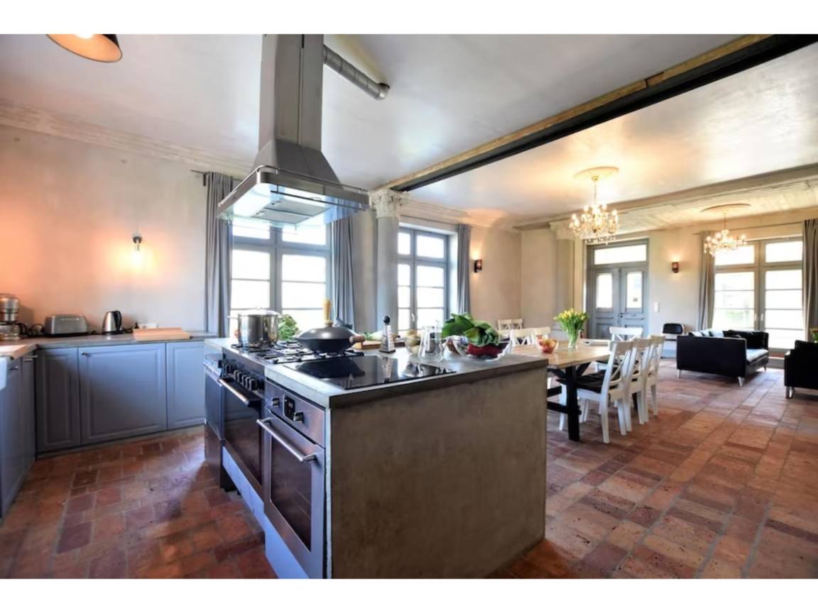 Layout : Parterre: 2x Eingang, offene Küche mit Wasserkocher, Kochherd, Dunstabzugshaube, Kaffeemaschine(Filter), Backofen, Geschirrspüler, Kühl-/Gefrierkombination , Wohnküche mit Wasserkocher, Kochherd, Dunstabzugshaube, Kaffeemaschine(Filter), Backofen, Geschirrspüler, Kühl-/Gefrierkombination , Wohn/Esszimmer mit 2x Einzelklappbett , TV(Flatscreen), Esstisch(6 Personen), Sitzecke , Wohn/Esszimmer mit TV(Flatscreen), Esstisch(8 Personen), Sitzecke , Schlafzimmer mit Doppelbett king size , 2x Badezimmer mit Waschbecken, Dusche, Toilette