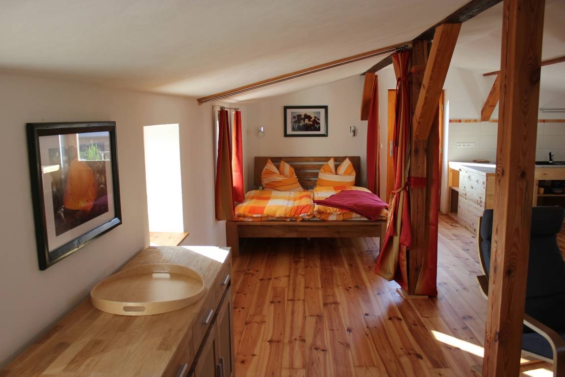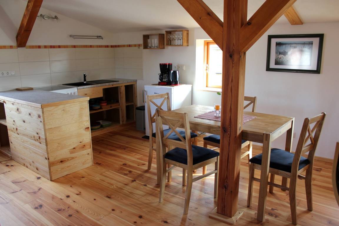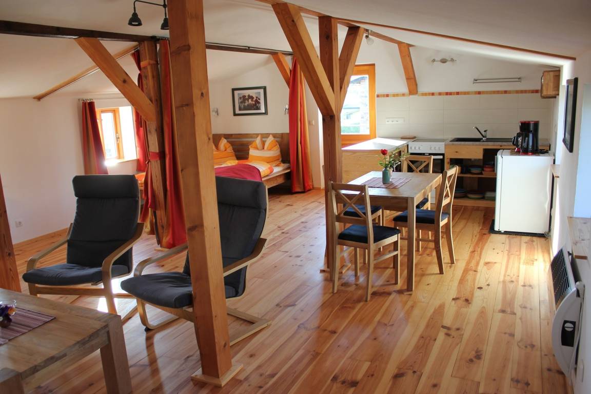 Das ruhig gelegene Appartement mit einem separatem Schlafzimmer liegt über der Kunstgalerie des jetzigen Kanuhofes. Es hat einen separaten Eingang. Im großzügigen sonnigen Wohnbereich von 43 m² befinden sich neben gemütlicher Fernseh- und Leseecke auch die gut ausgestattete Küchenzeile mit Esstisch sowie ein Doppelbett, das mit einem Vorhang abgetrennt werden kann. Das Schlafzimmer ist mit einem Etagenbett ausgestattet. Ein modernes Bad mit WC und Dusche sind selbstverständlich vorhanden. Die Räume sind mit Holzmöbeln im skandinavischen Stil eingerichtet. Auf dem weitläufigen Hof laden Sitzgelegenheiten zum Entspannen ein. Die rustikale Sitzecke im Gartens bietet auch die Möglichkeit, einen Grill zu nutzen.