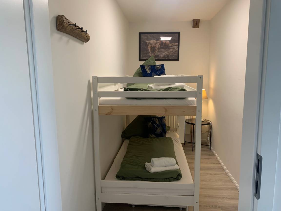Unsere modern eingerichtete Ferienwohnung bietet ausreichend Platz für 2 Erwachsene und 2 Kinder. Der einladende Wohn- und Essbereich mit offener Küche lädt zum verweilen ein. Im Kinderschlafzimmer befindet sich ein Etagenbett. Direkt vor der Tür findet auch ein grosser Pkw Platz. In unserem weitläufigen Garten finden sie auch eine separate Grillecke mit Essplatz.