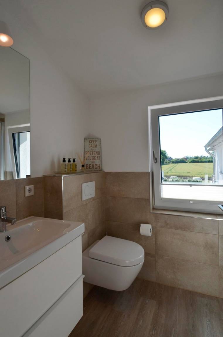 Das Badezimmer verfügt über ein Fenster und besticht durch seine hellen Fliesen. Es ist mit einer Dusche (RAINSHOWER), einem WC sowie einem Waschtisch mit Unterschrank ausgestattet.
