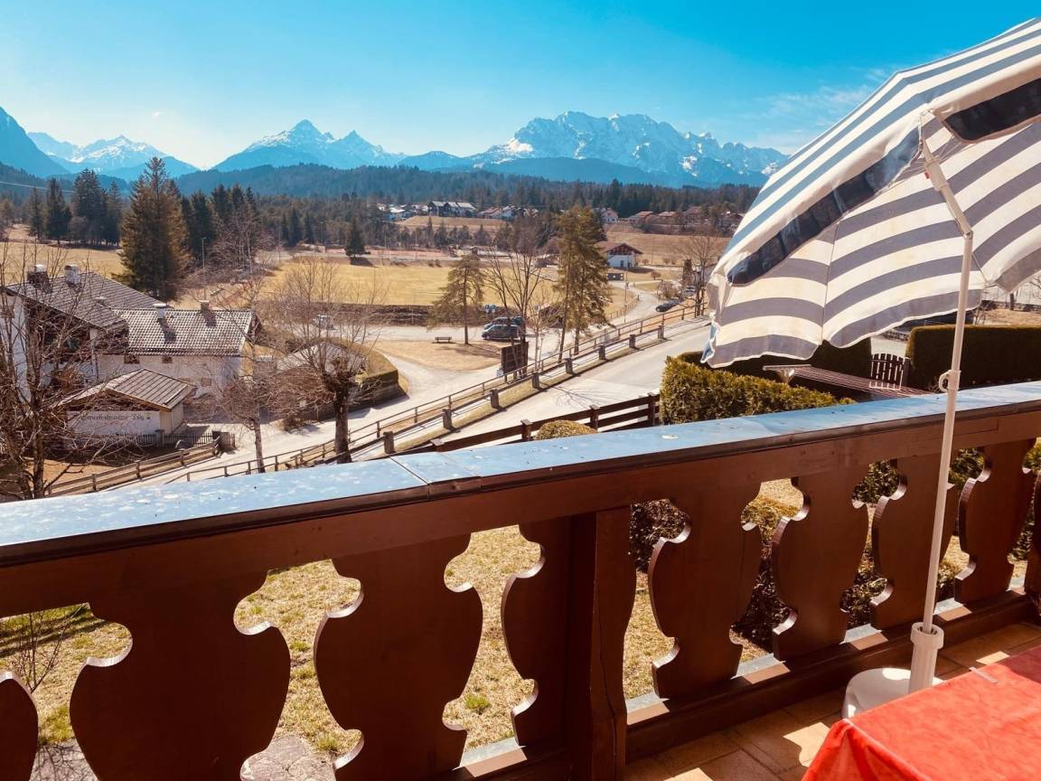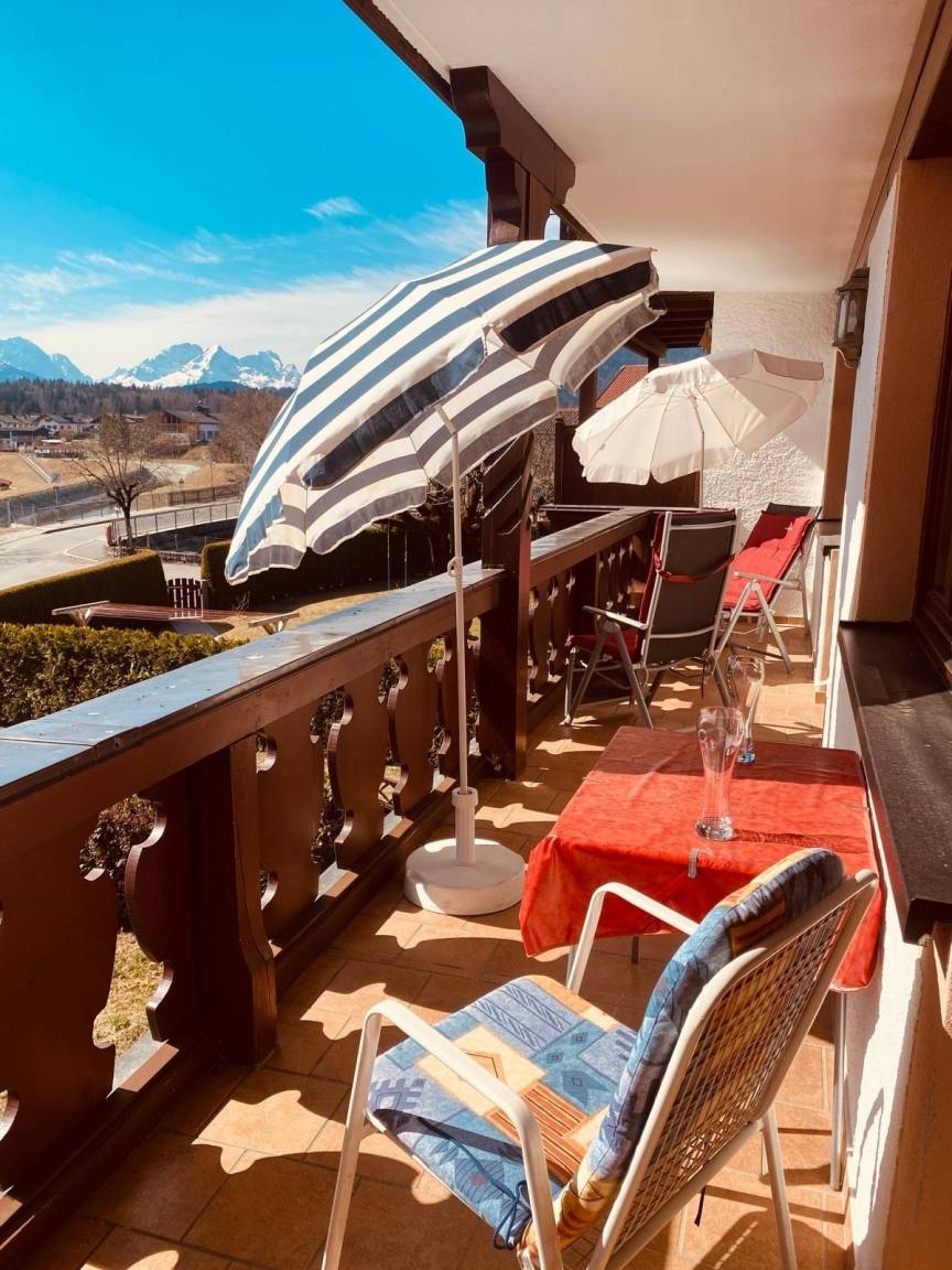 Ein sonniger Balkon für Frühstück mit Gipfelblick.