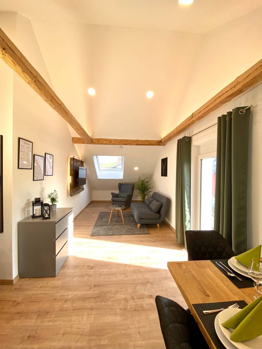 Diese besondere Wohnung sticht durch ihren modernen Einrichtungsstil heraus. Die Wohnung ist ausgestattet mit Übernachtungsmöglichkeiten für bis zu 4 Personen. Sie bietet eine gut eingerichtete Küche, einen stilvollen Essbereich, ein helles Badezimmer mit Dusche, ein gemütliches Schlafzimmer mit zwei Einzelbetten 90x200 cm, welche aufgrund ihrer praktischen Gestaltung ebenfalls zu einem Doppelbett verbunden werden können, einen einzigartigen Wohnbereich mit einem Sofa, das auch zu einem bequemen Bett 140x200 cm umfunktioniert