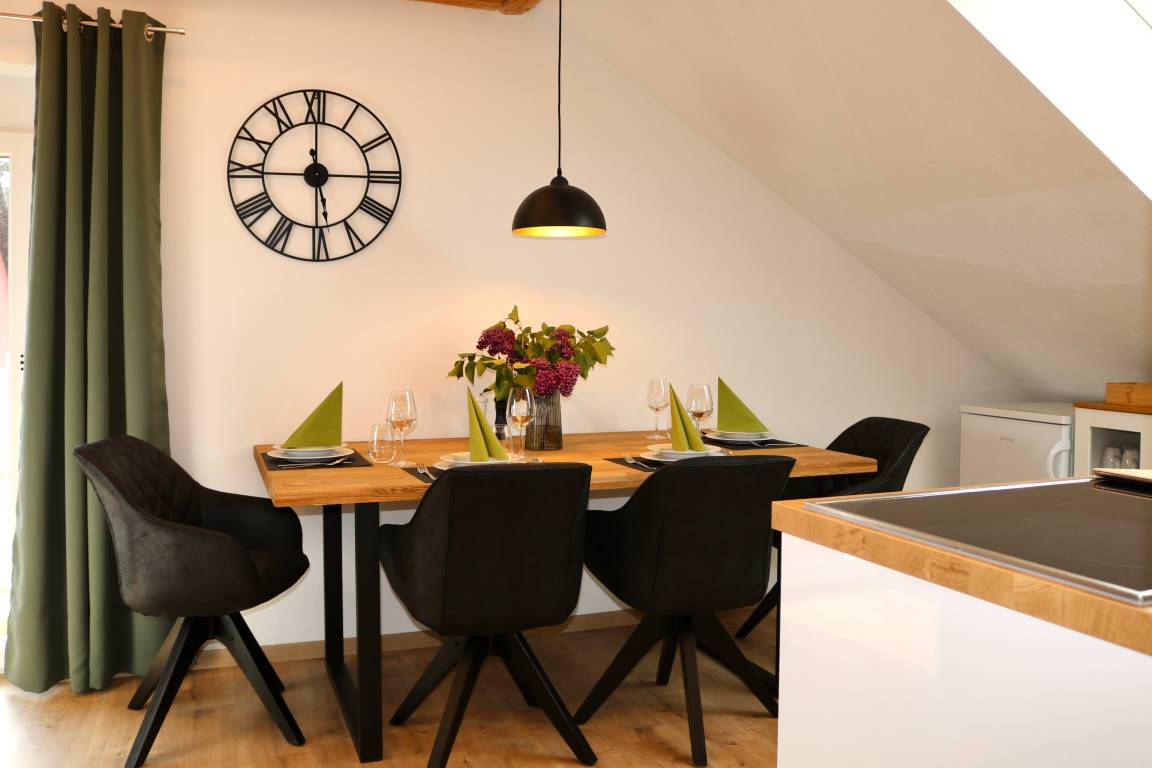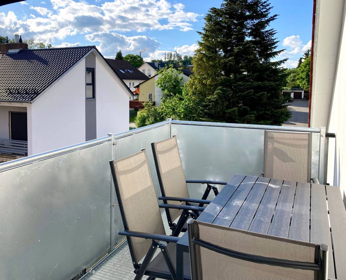 Der Balkon bietet frische Luft und Entspannung direkt an der Ferienwohnung. Die gut ausgestattete Küche besitzt unter anderem einen Kühlschrank, einen Herd zum Kochen und sogar eine Spülmaschine.