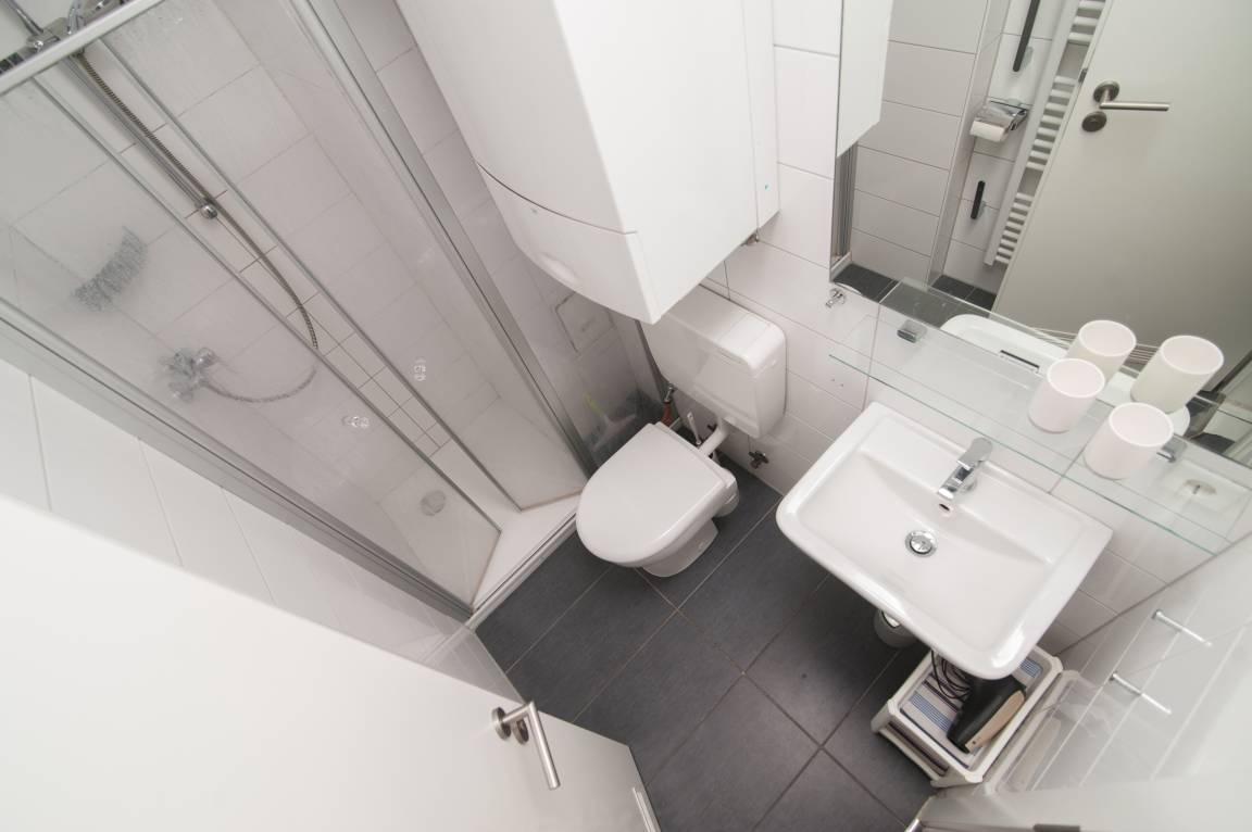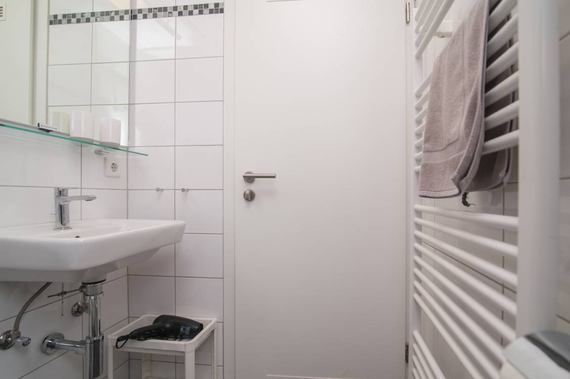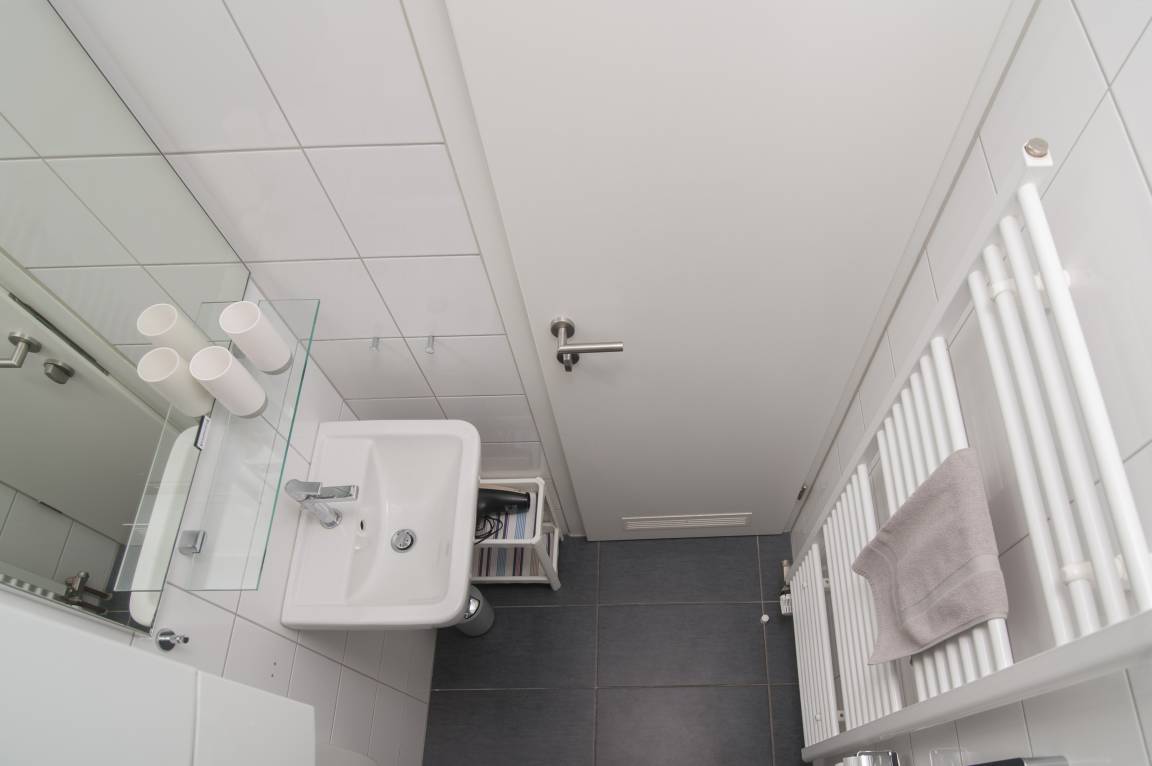 Das innenliegende Bad ist klein, aber fein und ist mit einem WC, einer Dusche mit niedrigem Einstieg und einem Handtuchtrockner ausgestattet.