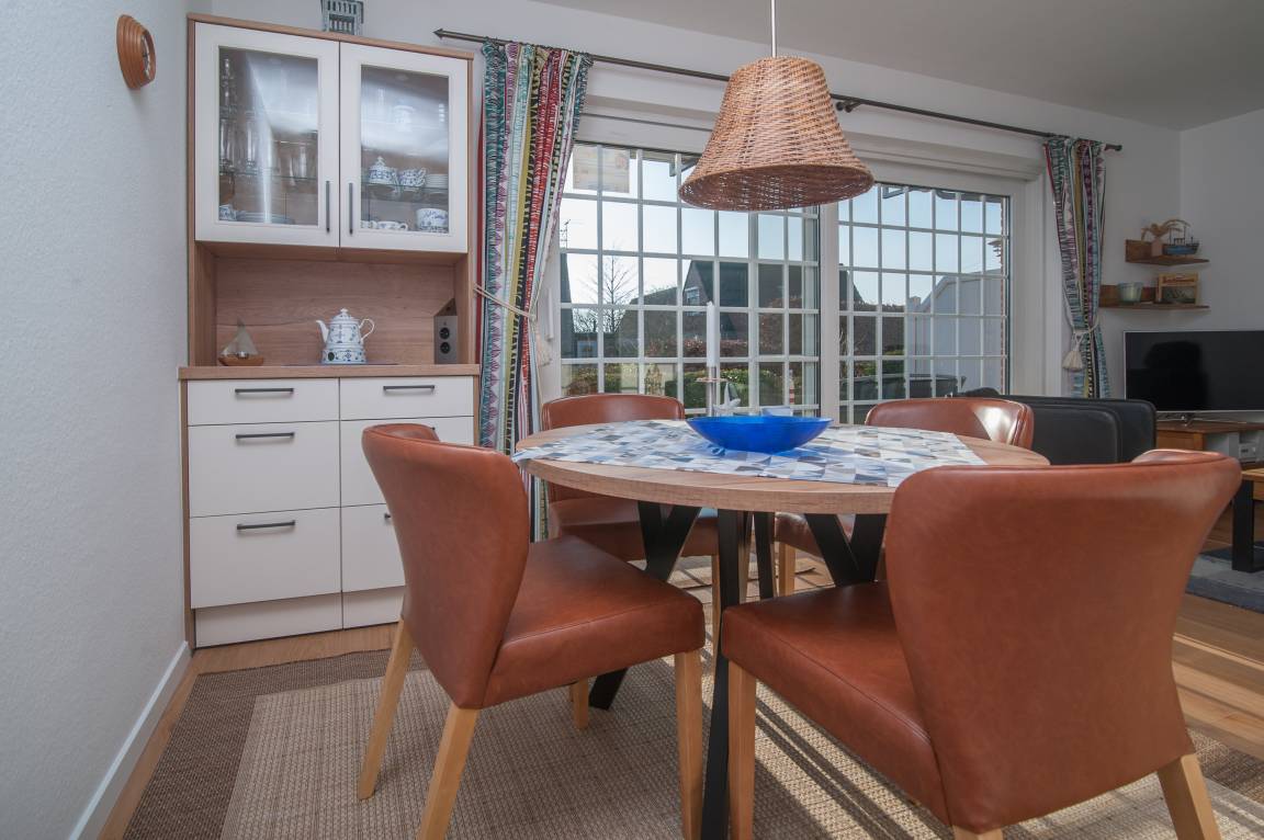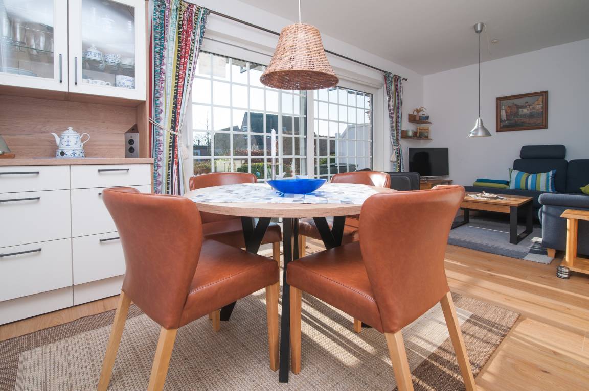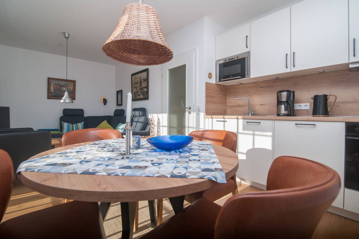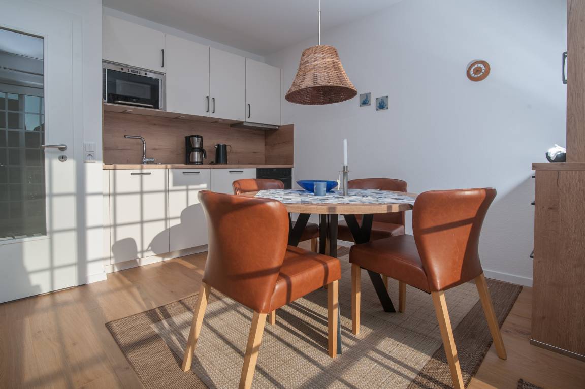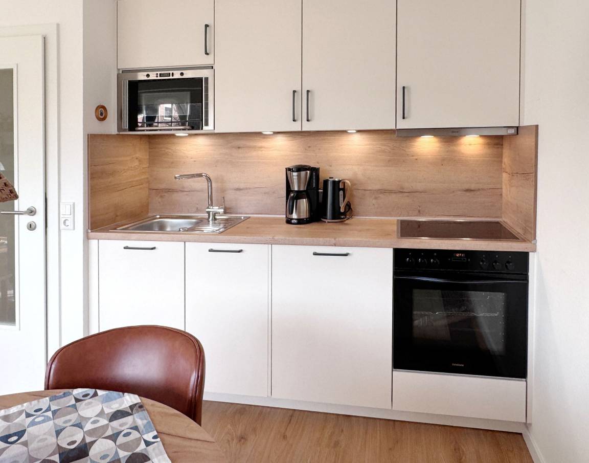 Der großzügige und helle Wohn- und Essraum mit integrierter Küche wurde im Januar 2026 erneuert. Der neue Bio-Vinylboden in Holzdesign schafft eine behagliche Atmosphäre. Ein bequemes Ecksofa mit einem 40-Zoll-Samsung-FullHD-LCD-TV, einer Stereoanlage und einem schnellen DSL-WLAN-Gastzugang lassen keine Wünsche offen. Die neue Einbauküche bietet Kühlschrank mit Gefrierfach, Spülmaschine, Backofen, Induktionskochfeld mit 4 Kochzonen, Mikrowelle, Dunstabzugshaube, Filter-Kaffeemaschine, Wasserkocher, Toaster, Handmixer, Mini-Zerkleinerer, Stabmixer, stilvolles Kaffee-, Tee- und Essgeschirr sowie umfangreiche Küchenutensilien. Ein runder Esstisch mit Stühlen komplettiert den Essbereich.