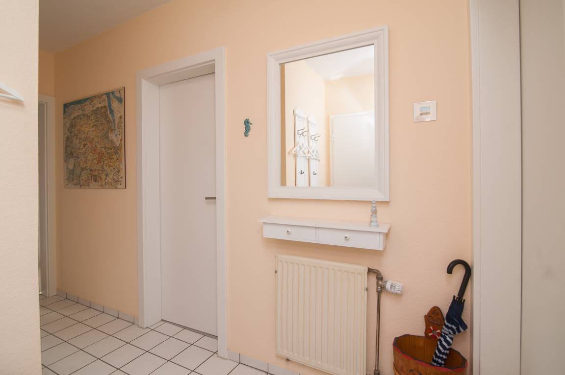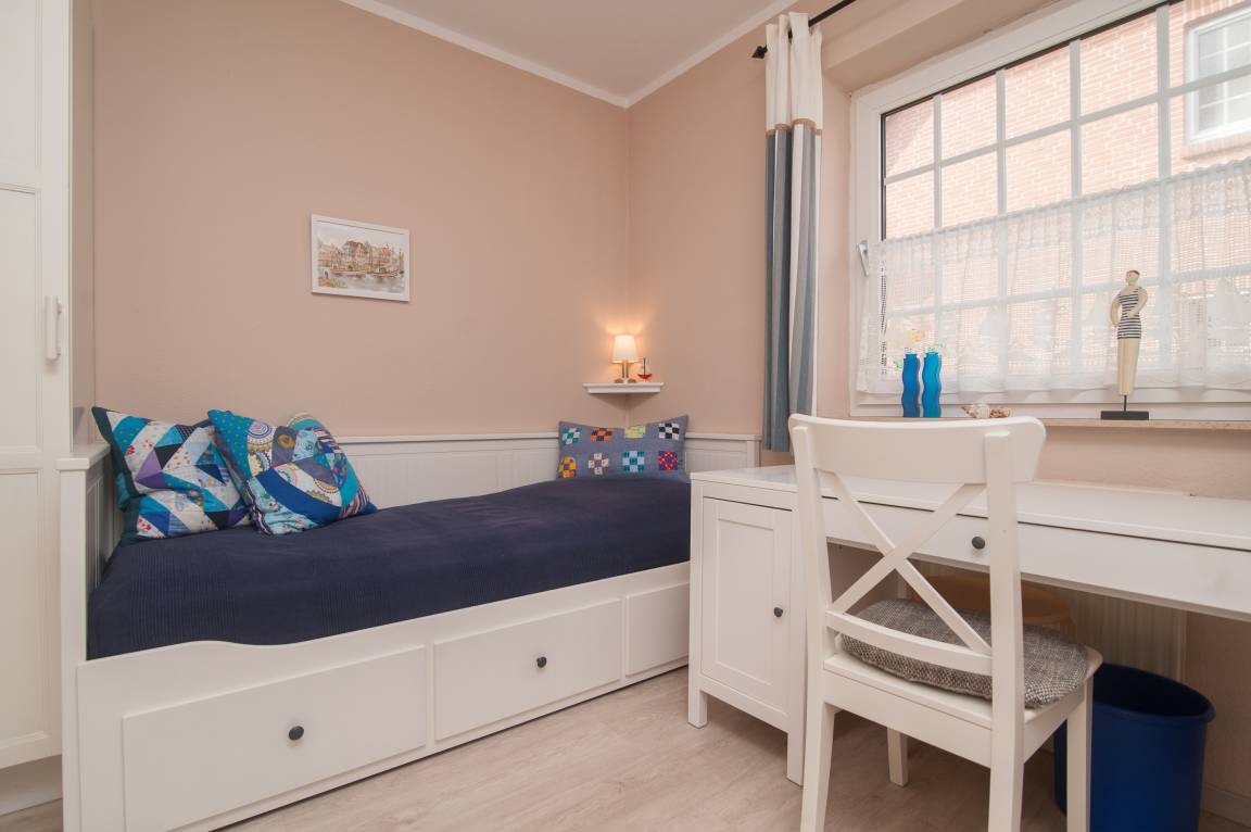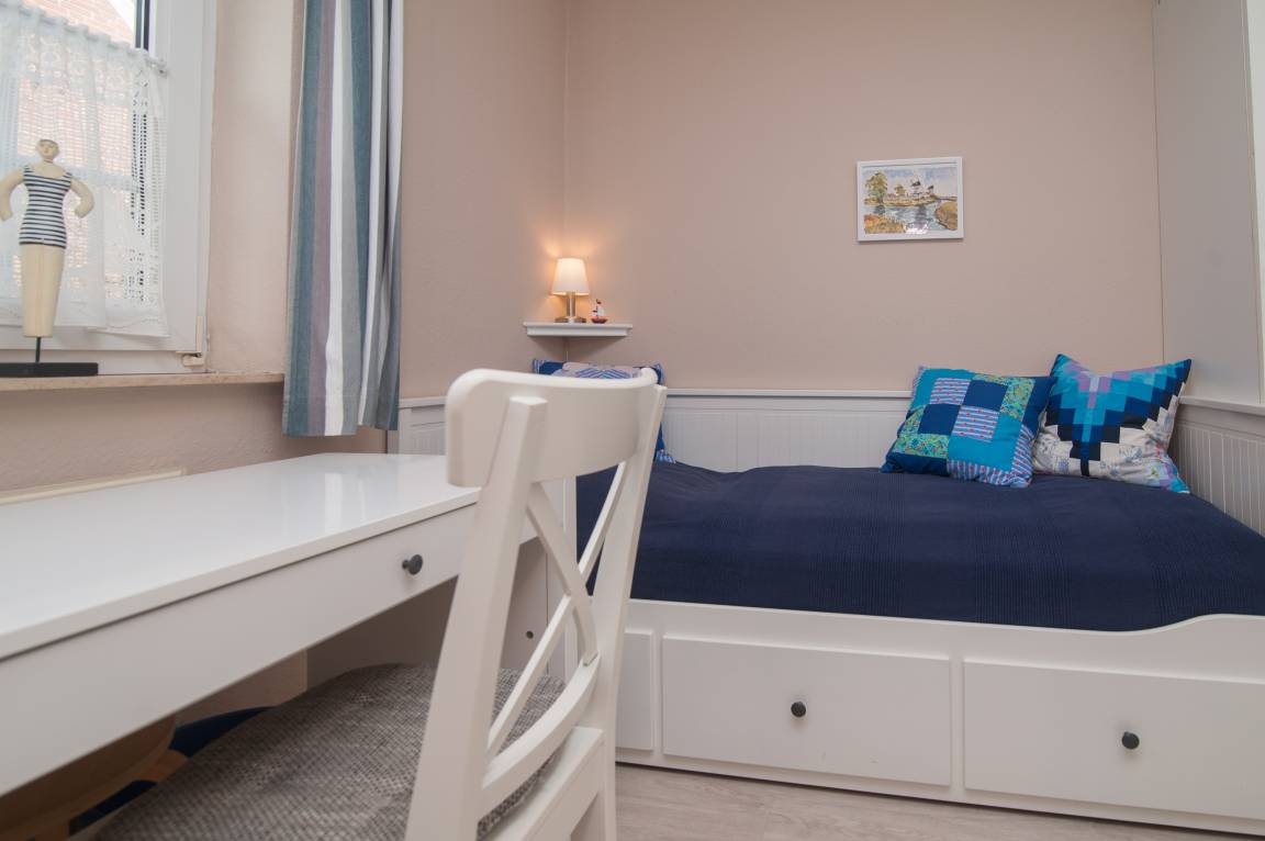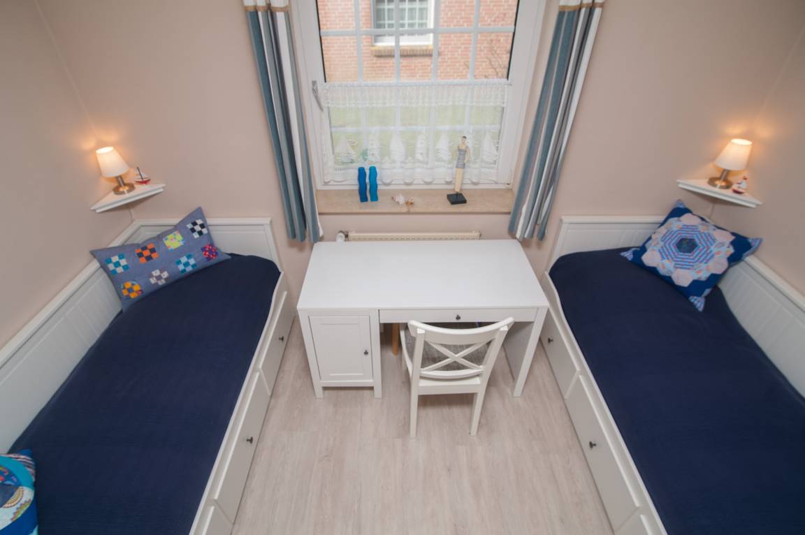 Die Wohnung wurde in den letzten Jahren komplett renoviert. Sie verfügt über 2 Schlafräume: ein Schlafraum mit einem Doppelbett (getrennte Matratzen 90 x 200 cm) sowie ein zweiter Schlafraum mit 2 Einzelbetten (80 x 200 cm) und einem Schreibtisch. Beide Zimmer sind im skandinavischen Stil mit weißen Möbeln und Vorhängen ausgestattet.