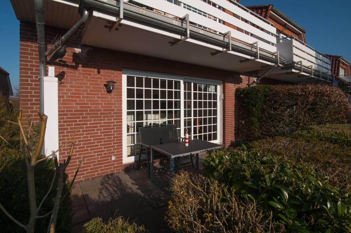 Vom Wohnraum aus gelangen Sie direkt auf die private, sonnige Südwestterrasse mit Sitzmöbeln und Sonnenschirm.