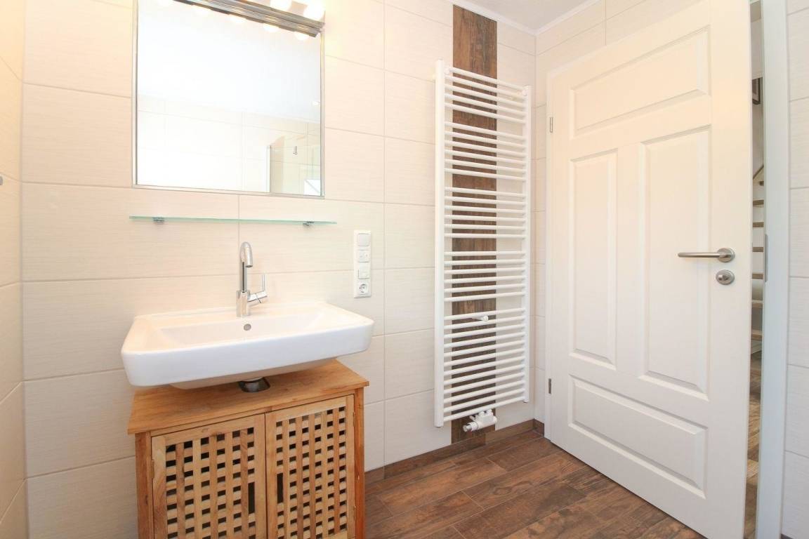 Das Badezimmer hat eine ebenerdige Dusche mit Ganzglastüren und Handtuchheizkörper sowie Fußbodenerwärmung.