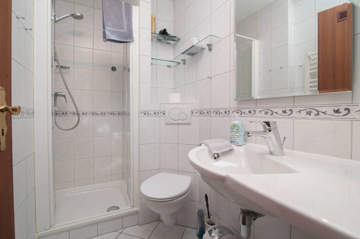 Das innenliegende Bad ist mit einem WC, einer Dusche mit niedrigem Einstieg und einem Handtuchtrockner ausgestattet.