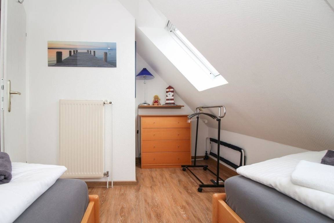 Im Obergeschoss befinden sich das Elternschlafzimmer mit einem Doppelbett und zweiten Fernseher und das Kinderschlafzimmer mit 2 Einzelbetten, ferner das innenliegende Bad mit Dusche und WC.