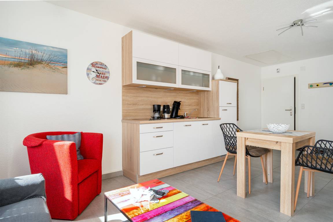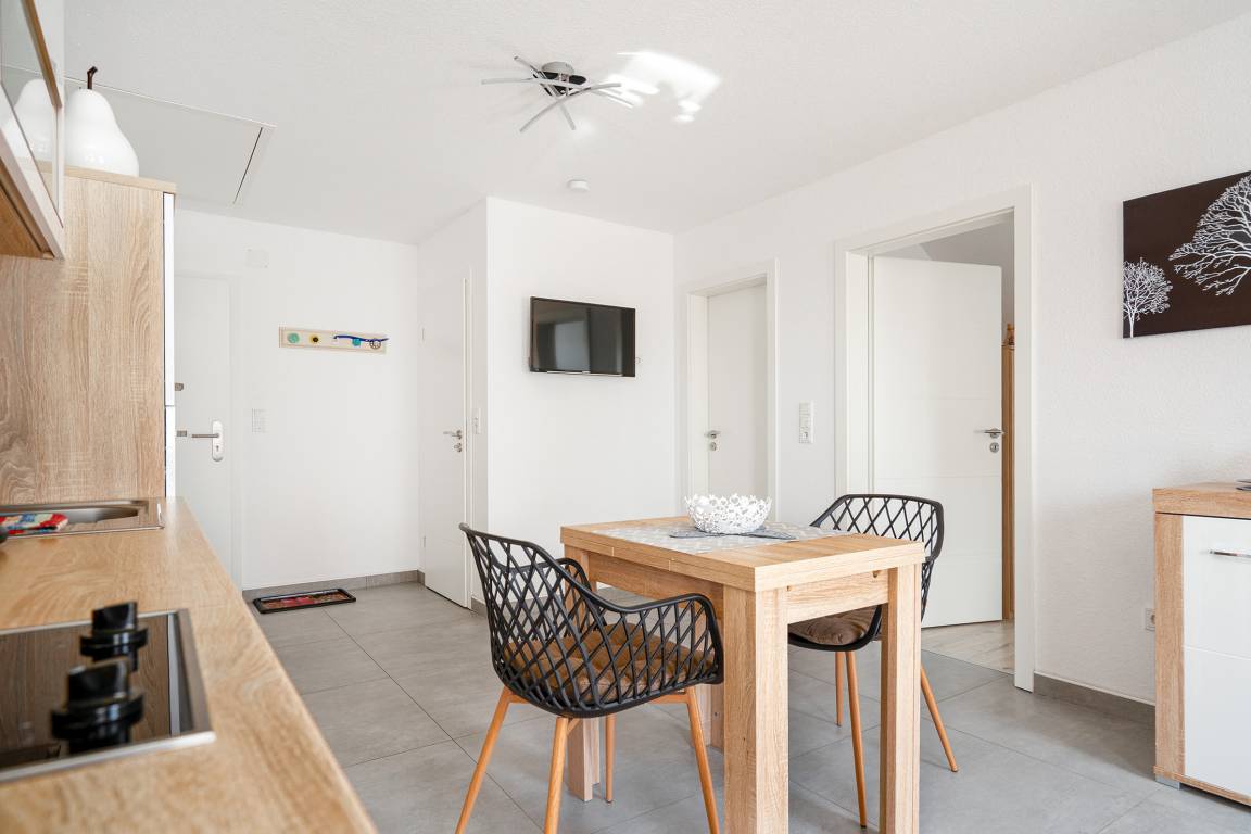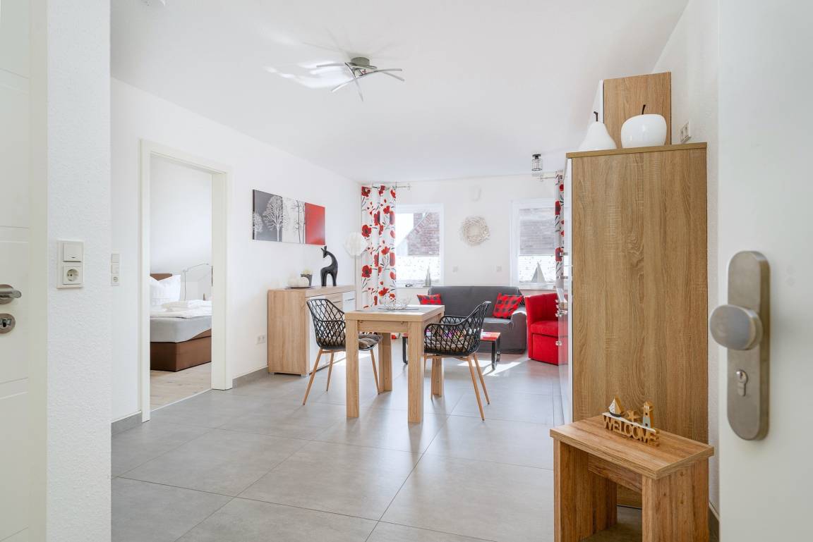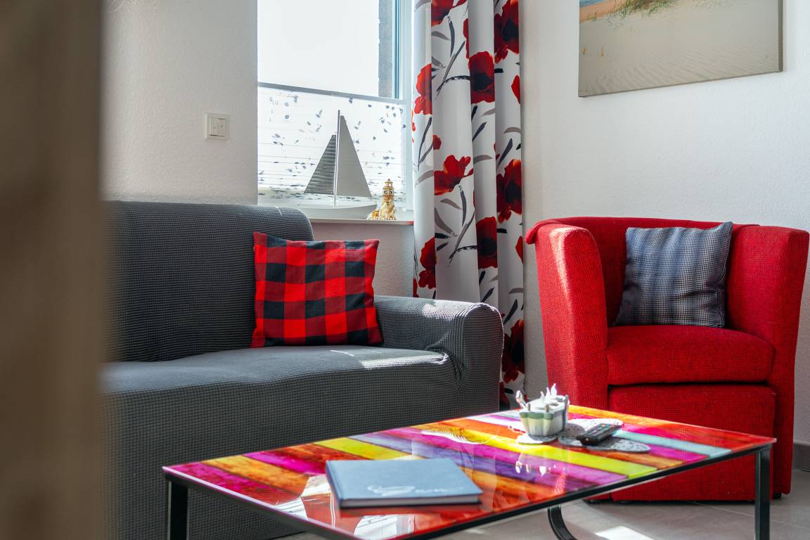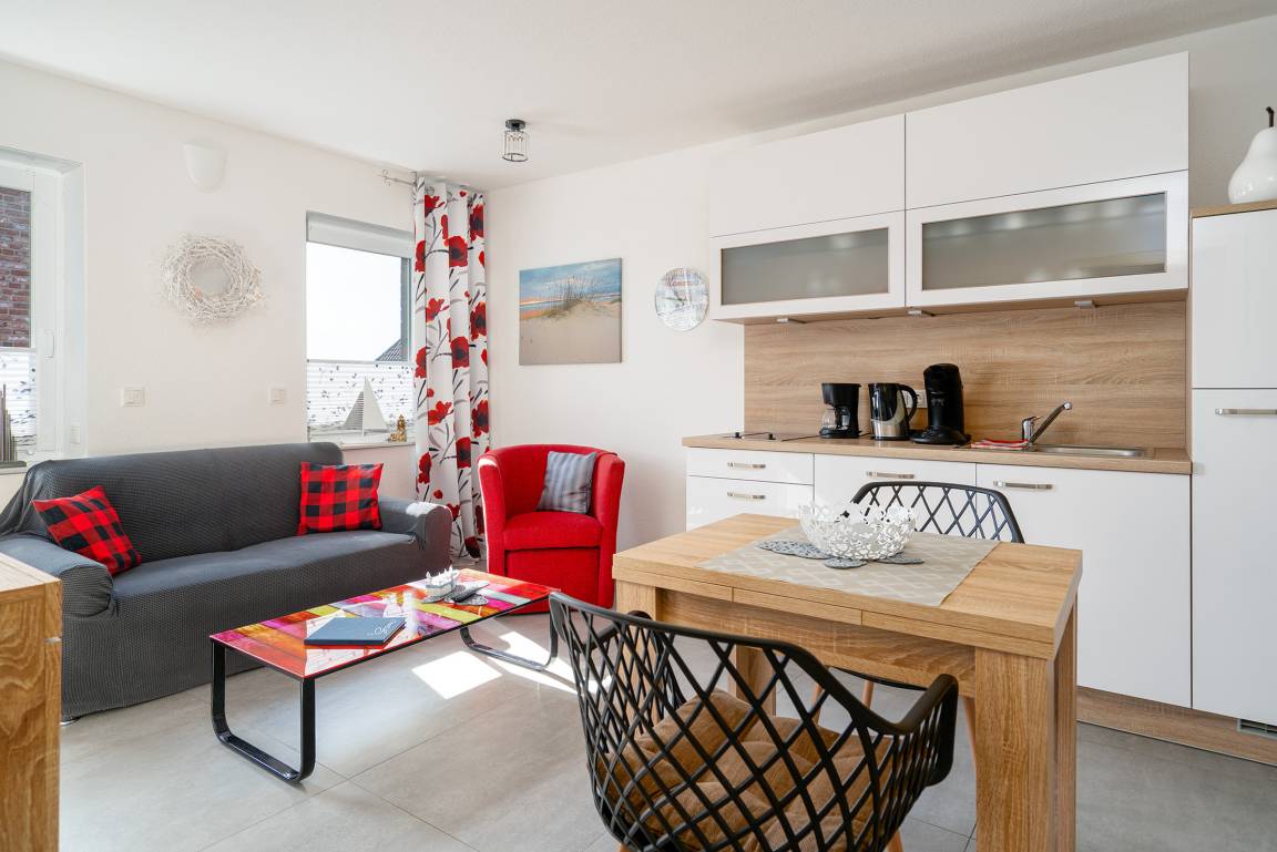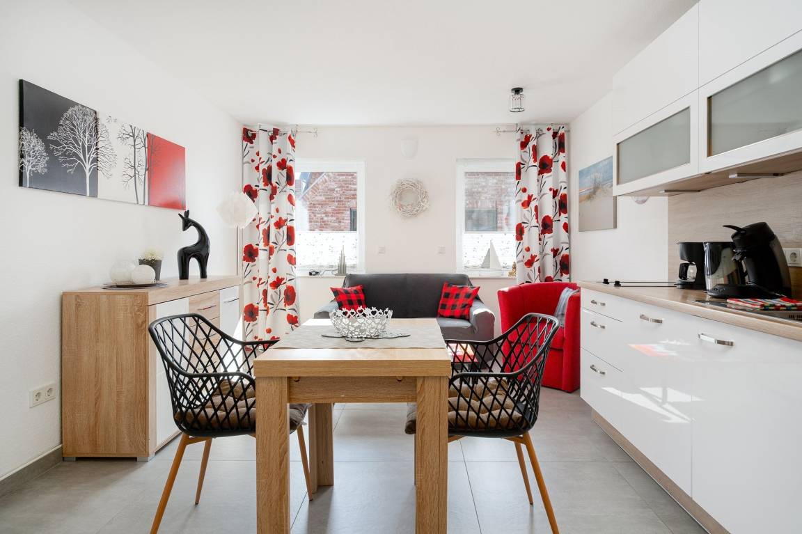 Verbringen Sie entspannte Tage in unserer charmanten Ferienwohnung „Krabbenkutter". Sie befindet sich im Obergeschoss eines Hauses mit insgesamt fünf Wohneinheiten und bietet auf 45qm Platz für zwei Personen. Der offene Wohn- und Essbereich bietet eine voll ausgestattete, moderne Einbauküche sowie einen Esstisch und eine gemütliche Sitzecke. Im separaten Schlafzimmer schlafen Sie bequem in einem hochwertigen Boxspringbett, ein zweiter Fernseher sorgt für zusätzlichen Komfort. Das helle Tageslichtbad ist großzügig geschnitten und mit einer ebenerdigen Dusche ausgestattet – ideal für einen frischen Start in den Tag. Zur Wohnung gehören außerdem ein eigener Parkplatz sowie ein Abstellraum für Fahrräder, in dem Sie auch E-Bikes laden können. Genießen Sie Greetsiel mit seinem historischen Ortskern, dem romantischen Hafen und der frischen Nordseeluft - die Wohnung „Krabbenkutter" ist der ideale Ausgangspunkt dafür.
