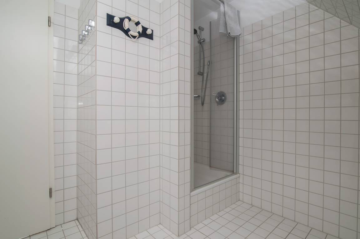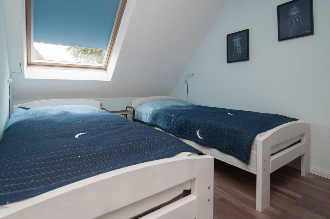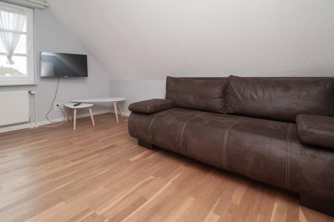 Von hier aus geht es, über ein Treppenhaus, in einen separaten Bereich im Obergeschoss. Hier stehen Ihnen ein Schlafraum mit 2 Einzelbetten, ein Badezimmer mit Dusche, Waschbecken und WC, sowie ein kleiner Wohnraum mit Sofa und Sessel und Flachbild-TV zur Verfügung.