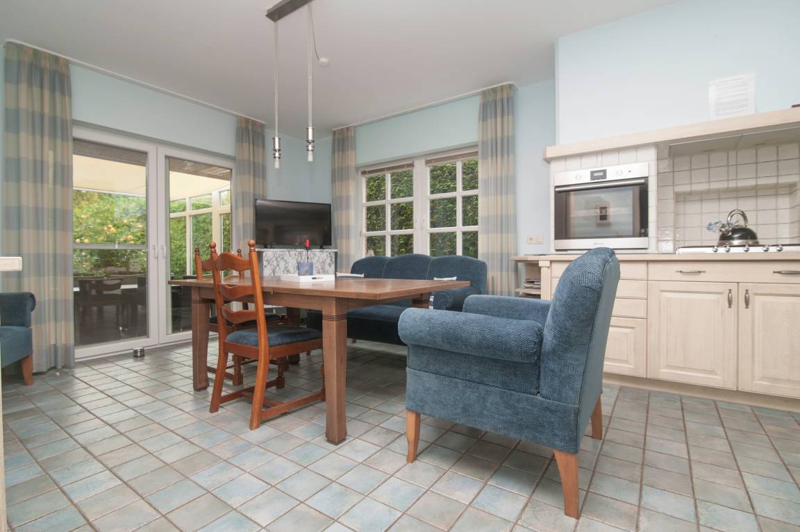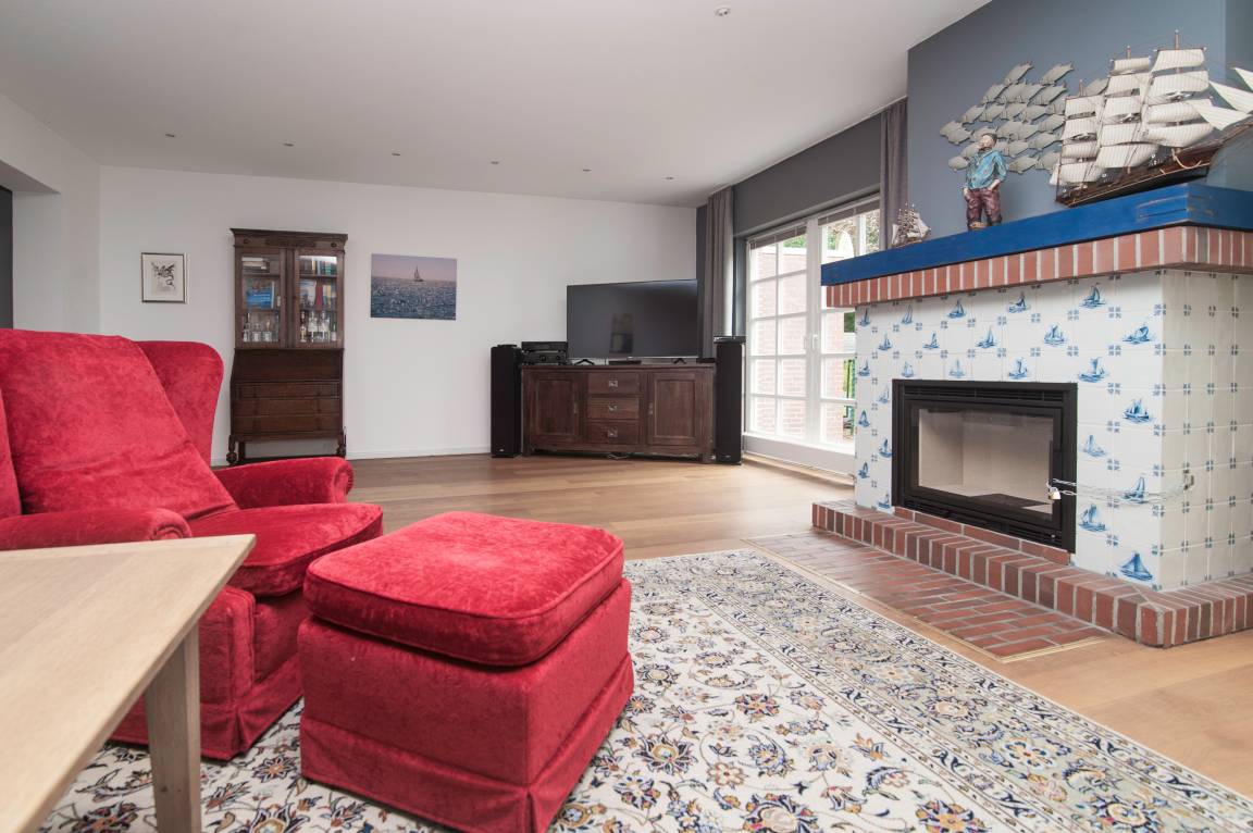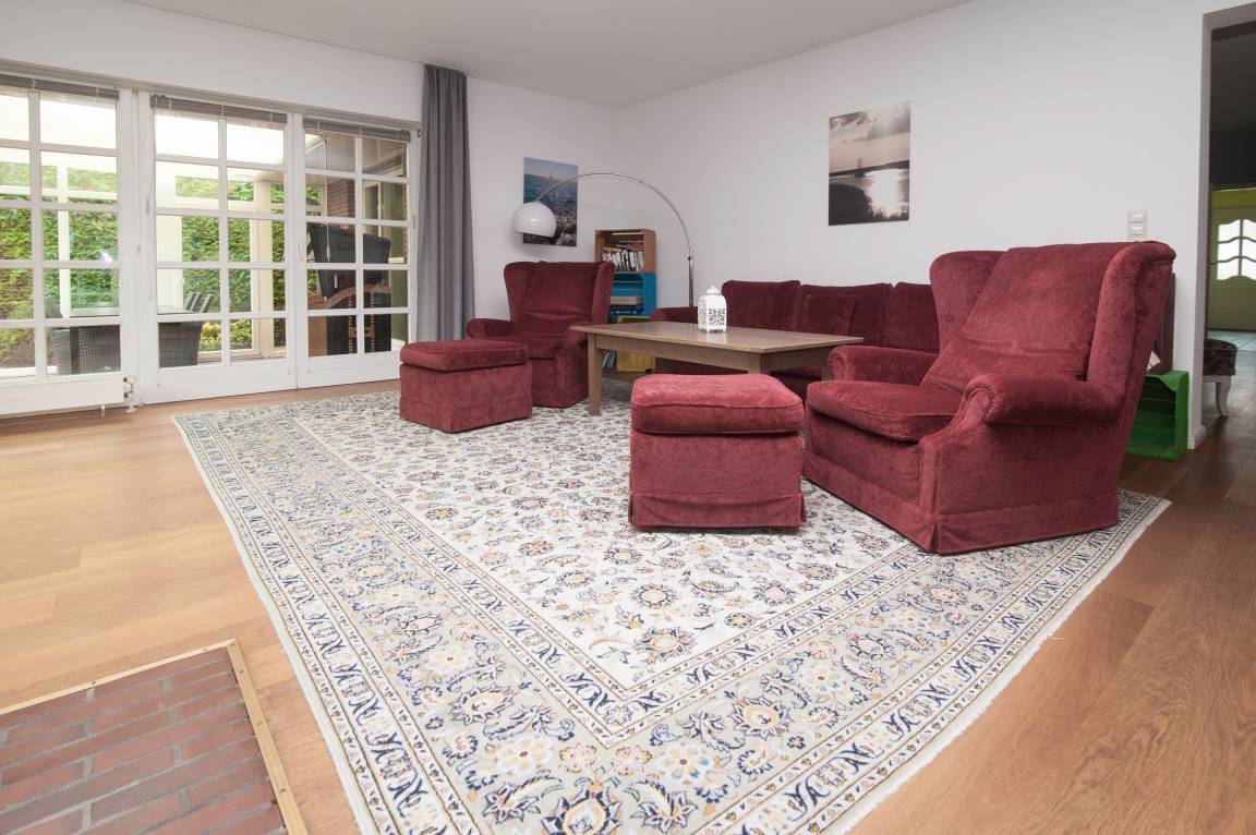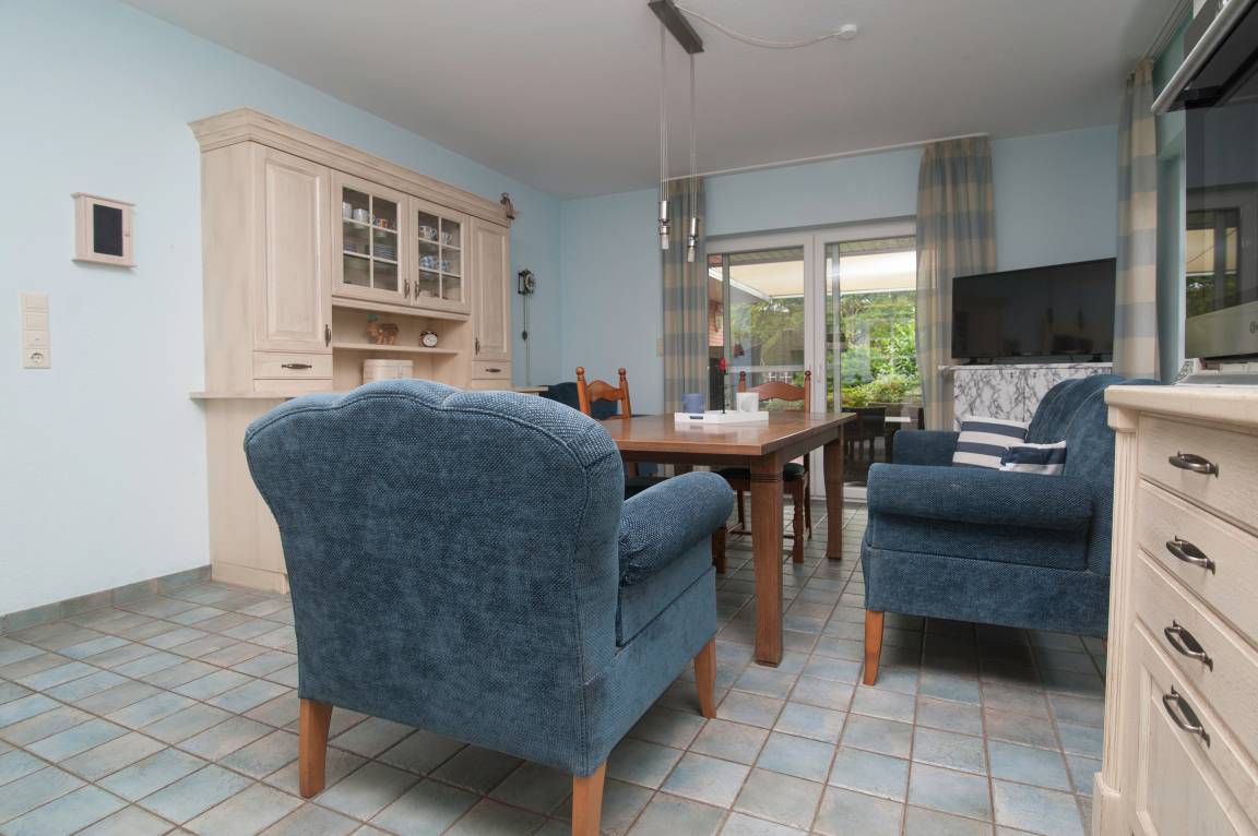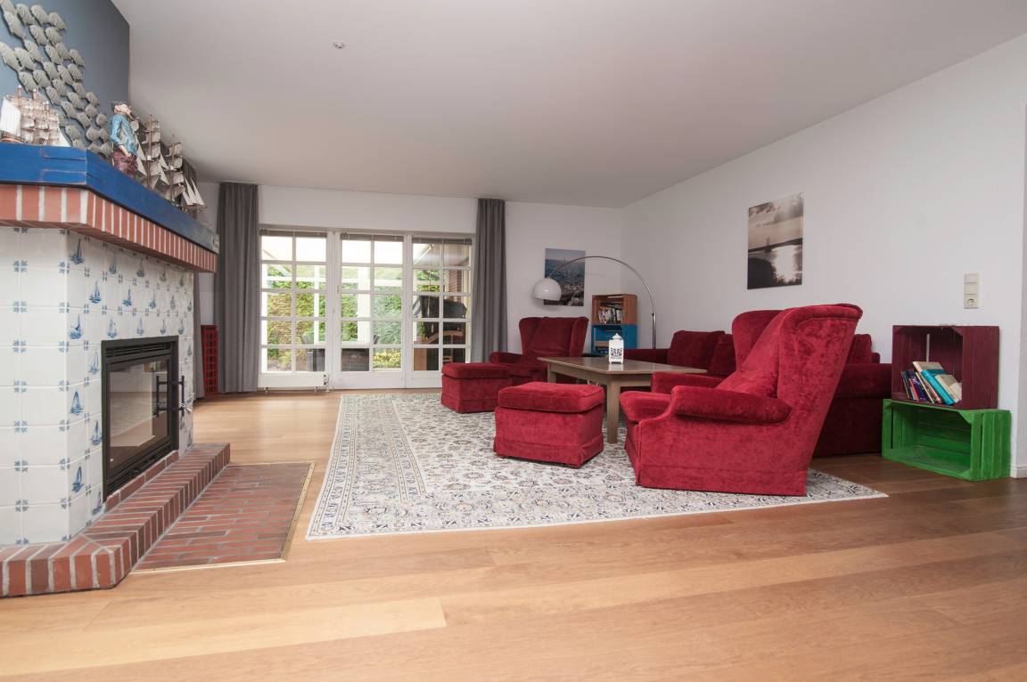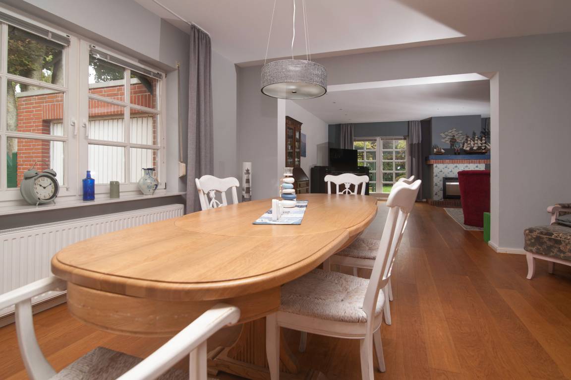 Im Erdgeschoss befindet sich der äußerst großzügige Wohn-/Essbereich mit 55'' Smart -TV, Blu-ray-Player, DSL WLAN-Gastzugang und mehr. Ein Tisch mit Ausziehfunktion für bis zu 10 Personen, ein großes Sofa und 2 Sessel mit Fußhockern laden zu gemütlichen Stunden ein. Der auf den Bildern zu sehende Kamin darf (nur gegen zusätzliches Reinigungsentgelt) genutzt werden.