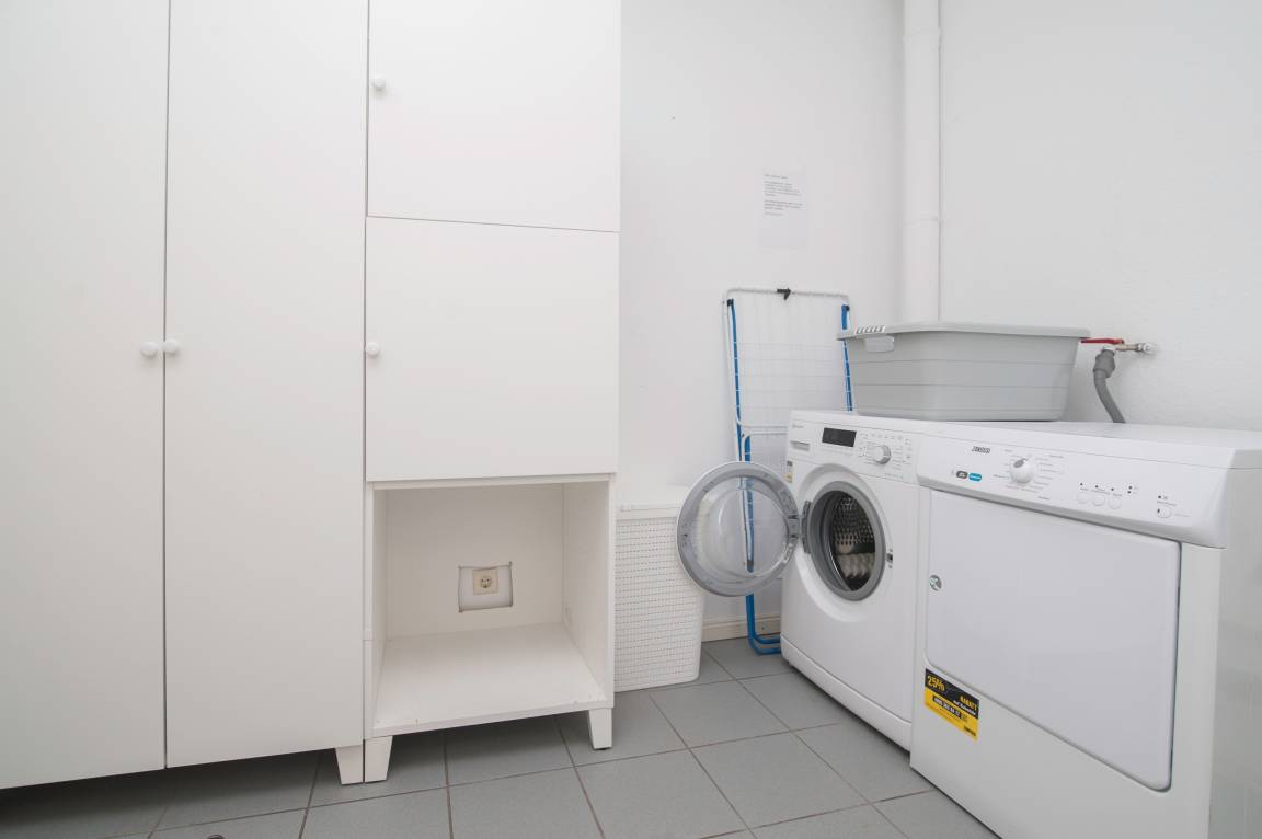 Vom sehr geräumigen Flur kommen Sie in den Hauswirtschaftsraum, hier stehen eine Waschmaschine (8kg), ein Wäschetrockner sowie Bügelbrett, Bügeleisen und ein kleiner Gefrierschrank zur Verfügung, eine Hunde-Dusche ist integriert. Im Flur befindet sich auch ein Gäste-WC.