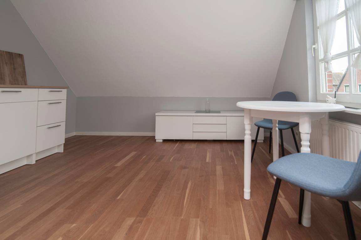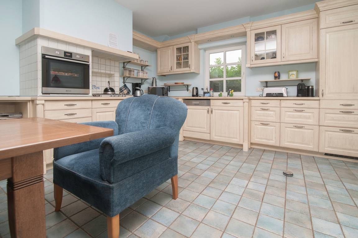 Im Erdgeschoss finden Sie ebenfalls eine separate, voll ausgestattete Wohnküche mit Flachbild-TV, Ostfriesensofa, 2 Sesseln und 2 Stühlen. Gasherd, einem Einbaubackofen in Sichthöhe, einem großen Kühlschrank, Geschirrspüler, Filterkaffeemaschine, Handrührgerät, Toaster, Eierkocher und vieles mehr sowie reichlich Koch- und Essgeschirr vor.
