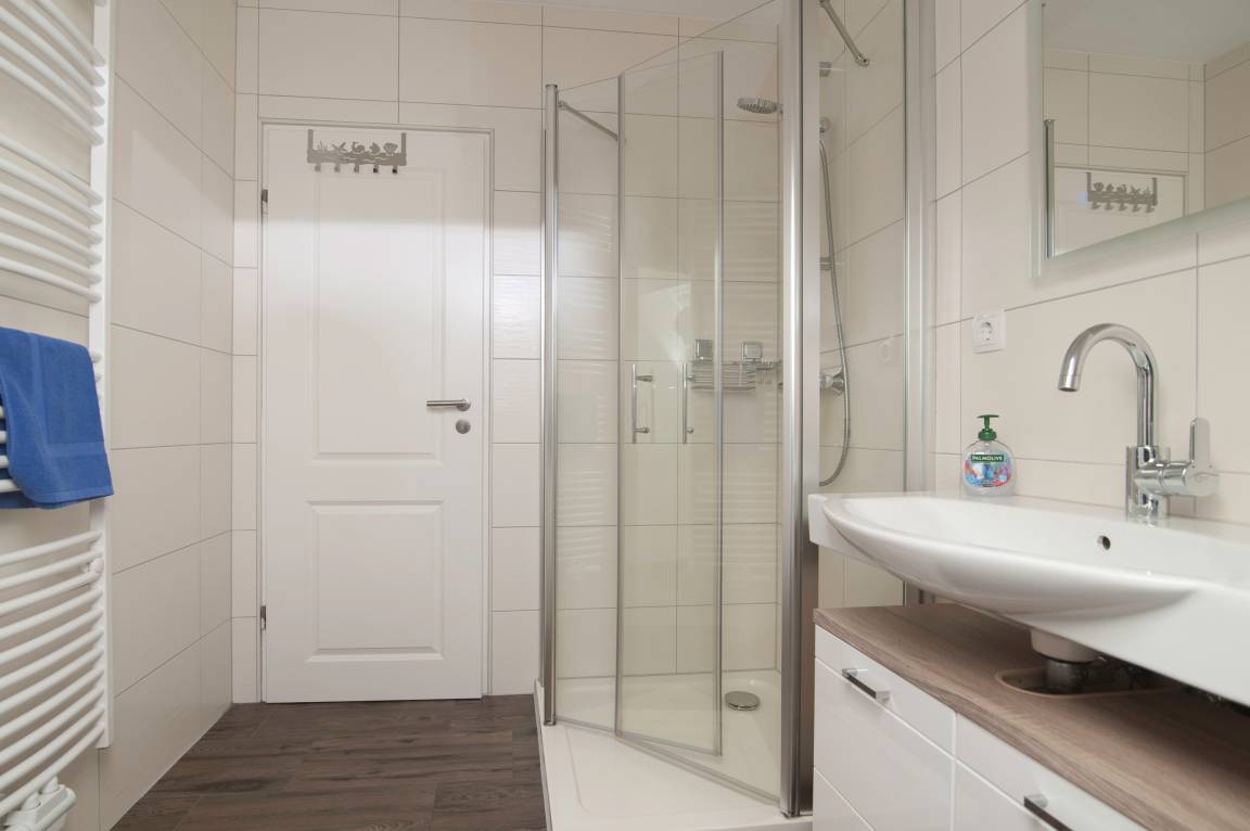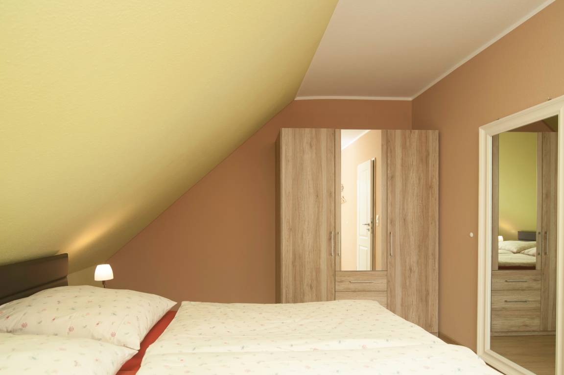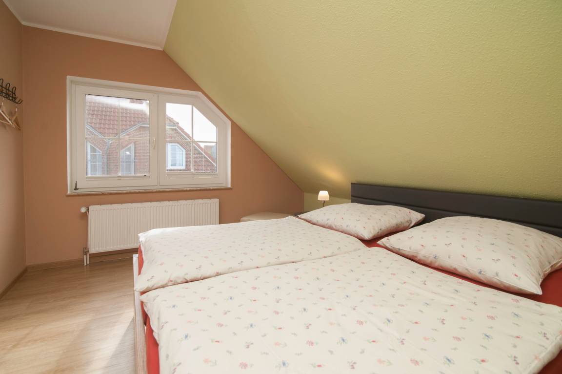 Im Obergeschoß befinden sich ein Badezimmer mit Dusche (niedriger Einstieg) und zwei Schlafzimmer, eines mit Doppelbett (2 x 90 x 200 cm) und Innenplissee, das zweite Schlafzimmer mit 2 Einzelbetten (90 x 200cm), Innenplissees und Verdunkelungsrollo.