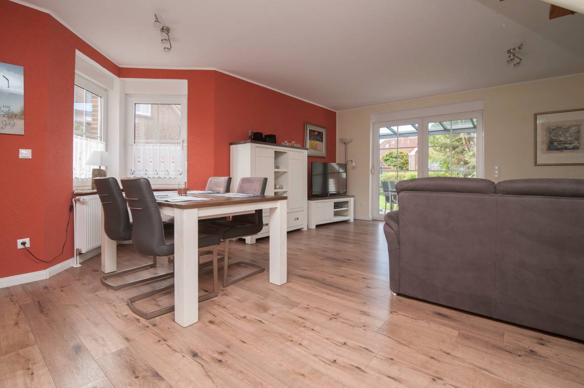 Der Essplatz ist mit 4 Stühlen ausgestattet und das großzügige Ecksofa bietet genügend Platz für gemütliche Stunden.