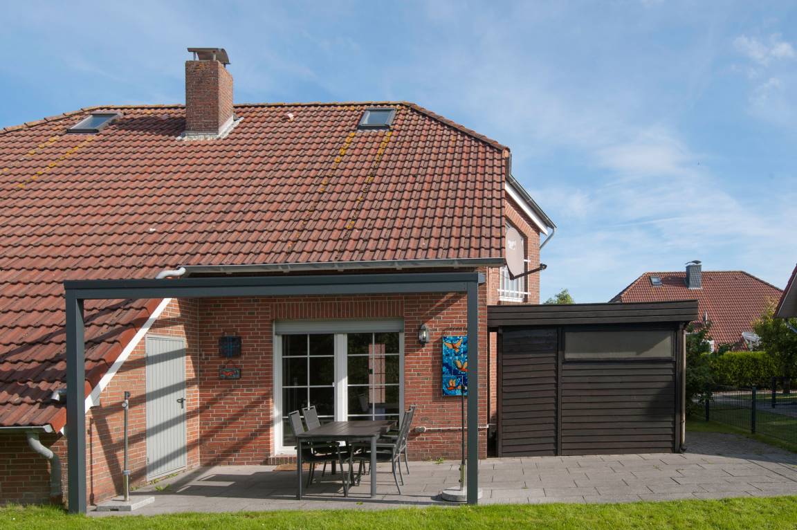 Die überdachte Terrasse und der kleine Garten in Südwestlage hinter dem Haus - ausgestattet mit Gartenmöbeln laden zum Verweilen ein. Ein separater abschließbarer Abstellraum mit Stromanschluss für Fahrräder und 2 PKW–Stellplätze befinden sich direkt am Haus.