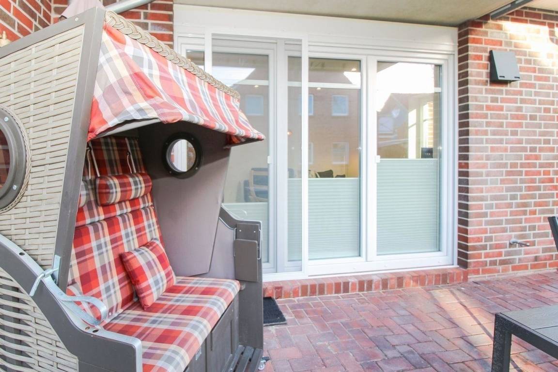 Der Terrasse am Haus, die sich vor den großen, lichtverwöhnten Fensterelementen befindet, schließt sich der Garten mit einer Rasenfläche an. Auf der Terrasse wartet ein gemütlicher Strandkorb auf Sie!