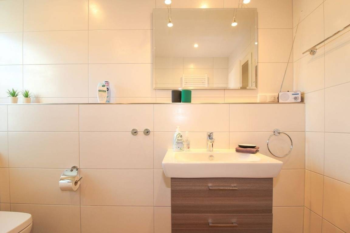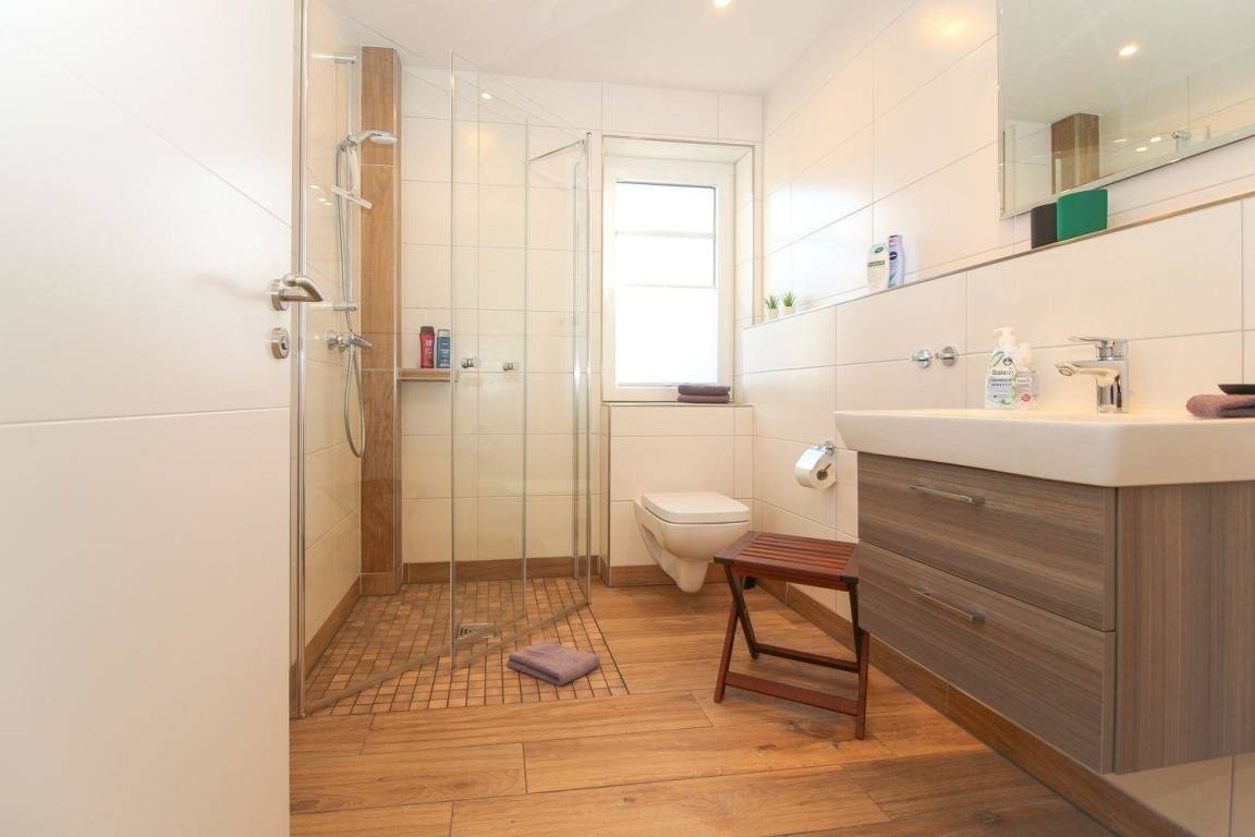 Im Bad befinden sich eine sehr große, bodentiefe Dusche, WC und Waschtisch mit Unterschrank - alles ist vorhanden. Der Handtuchwärmer schenkt an kalten Tagen warme Handtücher.