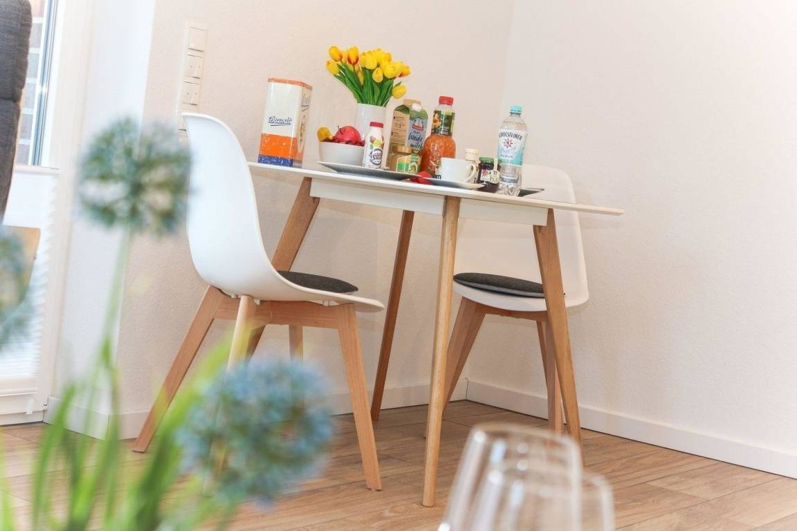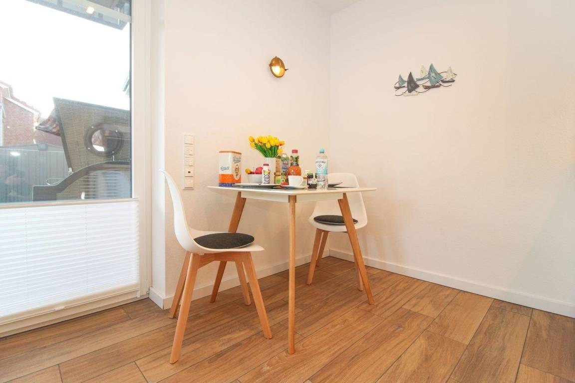 Der Wohn-/Essbereich ist der offenen Küche angegliedert. In der sehr gut ausgestatteten Küche sind alle notwendigen Geräte und Utensilien zum Kochen beherbergt. Am Esstisch finden zwei Personen und ein Baby ausreichend Platz.