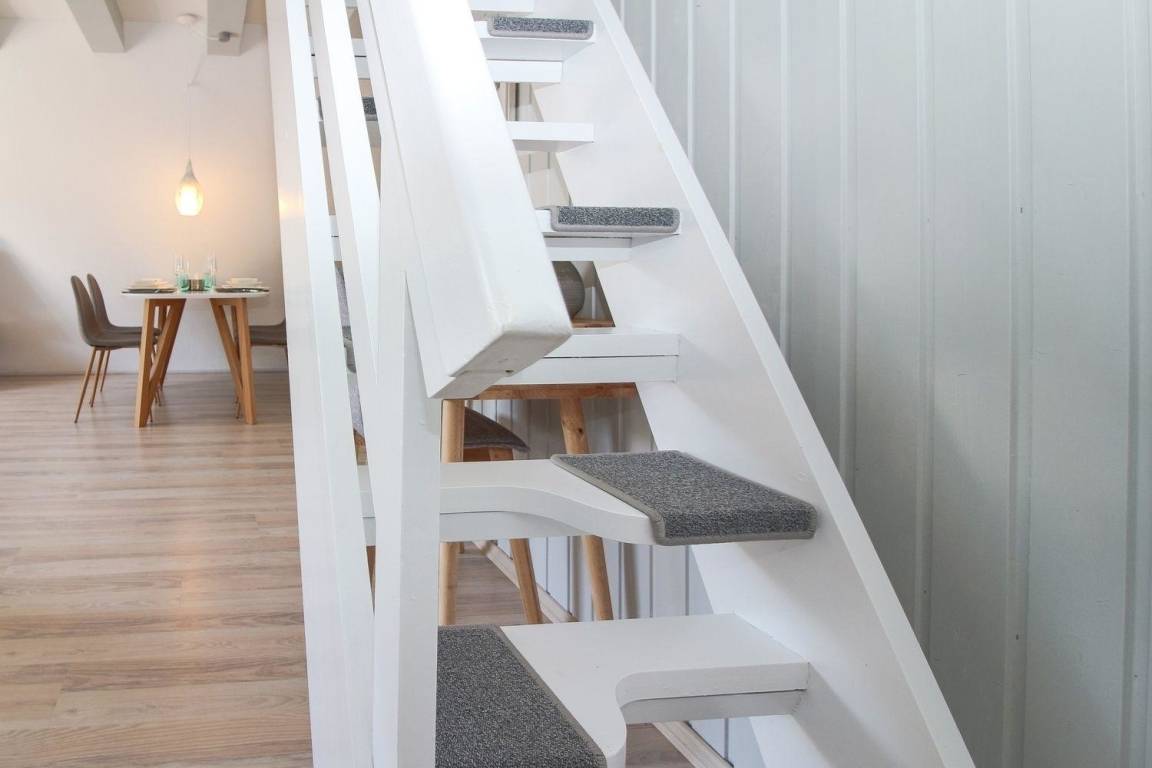 Bitte beachten Sie, dass es sich um eine steile Treppe zum Obergeschoss mit versetzten Stufen handelt.
