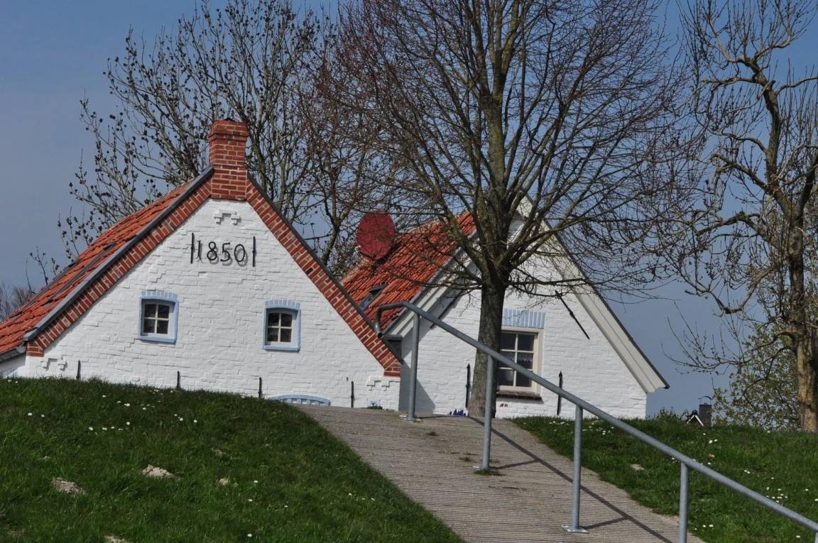 Es handelt sich um eines von zwei Häusern, die aneinander geschmiegt im Deich stehen. Jedes bietet vollkommen separates Wohnen.