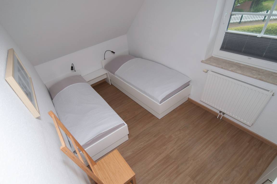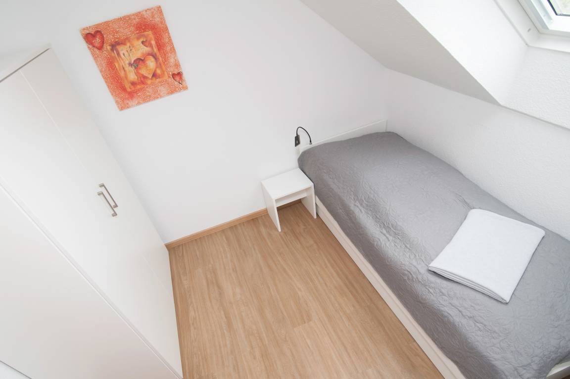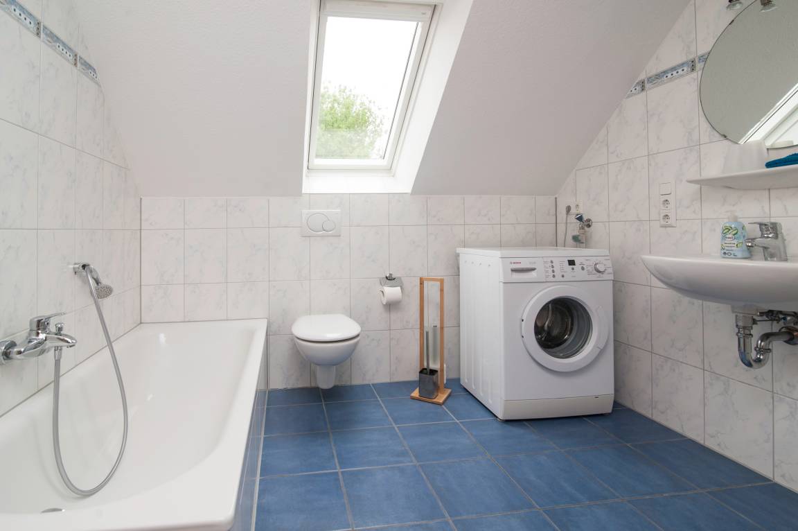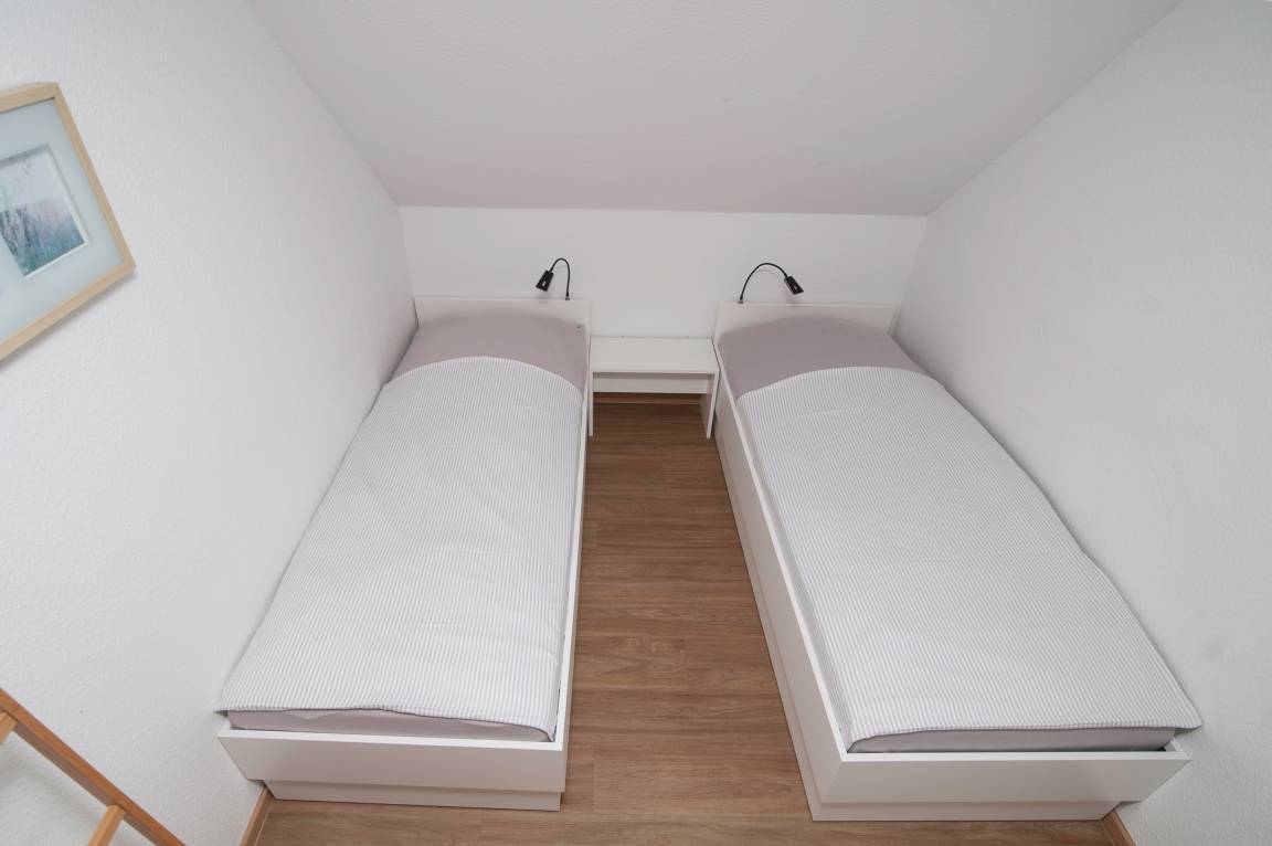 3 Schlafzimmer im Obergeschoß: 1 Schlafzimmer mit Doppelbett (1,60 mx 2,00 m), 1 Schlafzimmer mit 2 einzelnen Betten[nbsp] (0,80 x 2,00m) und 1 Schlafzimmer mit einem Einzelbett. in der Größe. Der Fußboden ist mit Vinyllaminat ausgestattet. Das Badezimmer mit WC, Badewanne und Dusche sowie Waschmaschine sind ebenfalls im Obergeschoß. Bügelbrett und Bügeleisen und ein Wäscheständer stehen ebenfalls zur Verfügung.